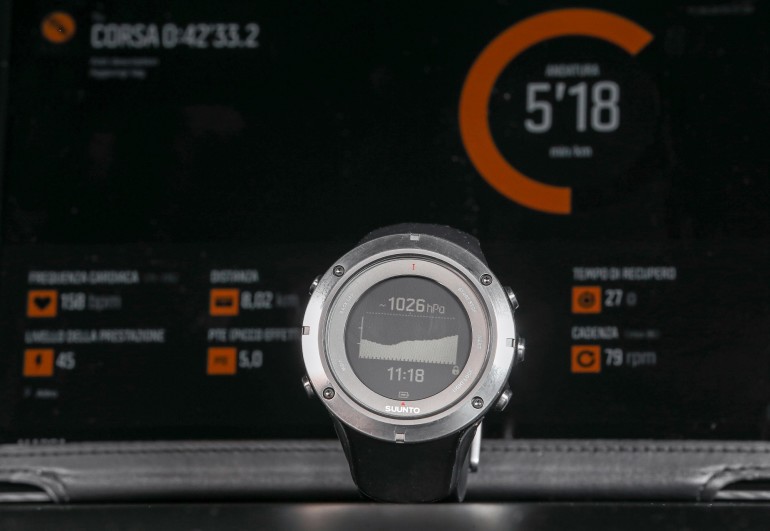 RUNDurante la corsa il diametro del display e la superficie dei cristalli liquidi permettono una rapida visione dell’andamento dell’allenamento e consentono di selezionare la configurazione delle informazioni secondo le esigenze personali, lasciando in primo piano la frequenza cardiaca piuttosto che del passo al chilometro o della velocità media. E’ riduttivo definire uno strumento come l’Ambit3 semplicemente orologio da training anche perché le varietà di indicazioni permette di avere a portata di sguardo praticamente ogni parametro utile per capire l’andamento della corsa e per i fanatici del trail anche il variare delle condizioni meteo con una stima della tendenza forte di una rilevazione in tempo reale della pressione barometrica .