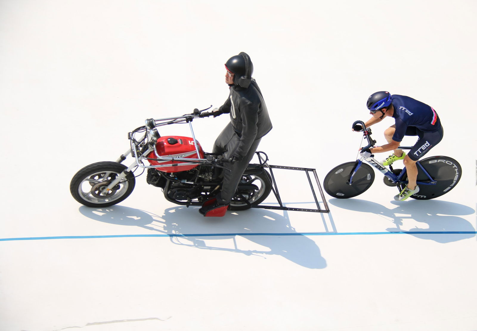Non sembra, ma pedalare con il 66×15 a 72 all’ora per 100 giri, dietro una moto puzzolente e spaccatimpani è una delle più affascinanti specialità del ciclismo su pista. E altrettanto affascinante è progettare le bici con cui questi ciclisti coraggiosi (o squilibrati) pedalano nei velodromi, perché sono completamente diverse da qualsiasi altra, con misure stabilite dai regolamenti e impostazione determinata dalle dinamiche di guida.