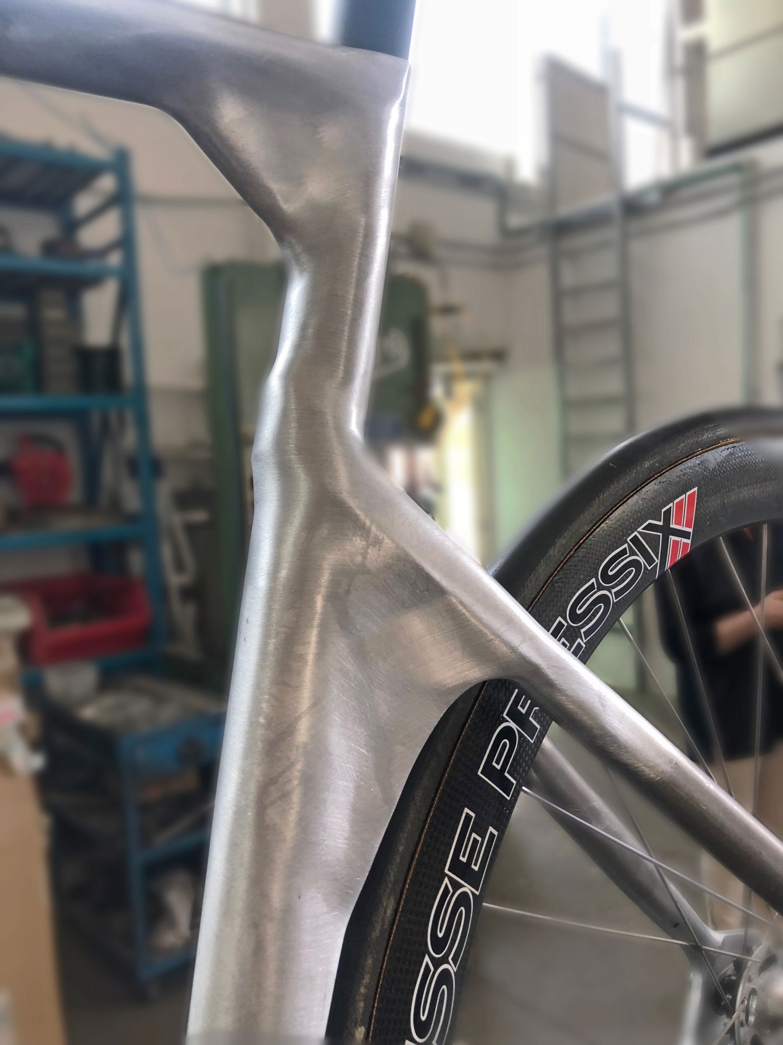 Il telaio ha angoli molto particolari per l’altezza sella di Alessandro Mariani, con un seat-tube a 76,8° e uno sterzo a 75°, abbinati a un orizzontale virtuale di 584 mm. Lo head tube è di 220 mm ma lo stack è comunque contenuto in 543 mm. La zona sterzo è stata irrigidita per avere grande guidabilità, i movimenti del ciclista sul rullo, in curva, sono millimetrici e importantissimi: la scia infatti si sposta verso l’esterno della traiettoria e il ciclista deve spostarsi in ingresso di curva alla destra del pacer in modo fluido e morbido così da non innescare sbandamenti e restare il più vicino possibile al rullo. La stabilità è tutto e per questo anche la zona posteriore è stata carenata per aumentare la trazione e mantenere i flussi d’aria più puliti possibile sulla ruota posteriore.