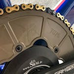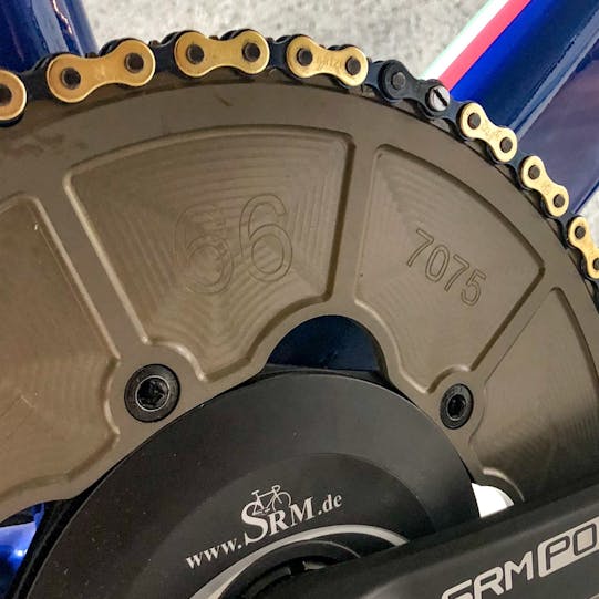 rake negativo. Al movimento centrale T47 è accoppiata una pedivella Origin in alluminio SRM con misuratore di potenza e corona Royce UK 66T con trattamento di ossidazione dura fatto in Italia da GPS e una catena Izumi. I