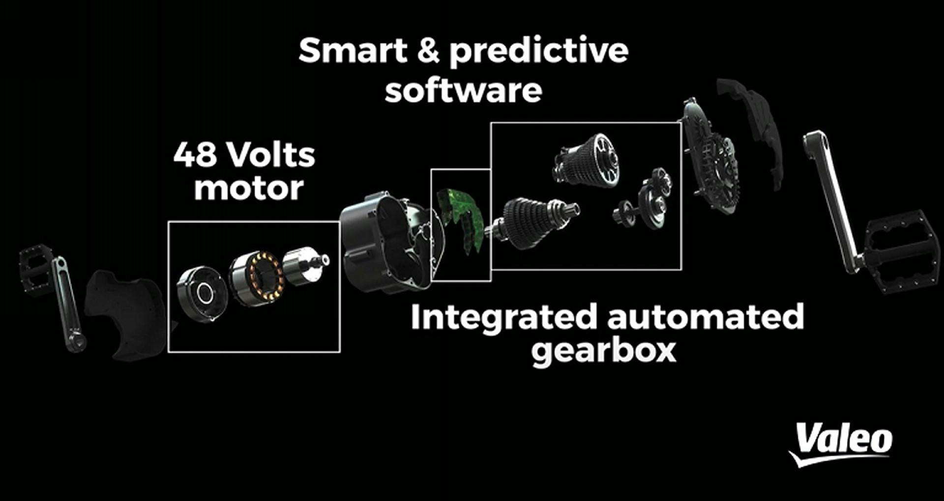 La tecnologia Valeo, sviluppata in partnership con Effigear, raggruppa in un’unica unità situata nella scatola movimento un motore elettrico a 48 V e un cambio automatico adattivo a sette velocità. Con una coppia motrice pari a 130 Nm, può moltiplicare per otto volte lo sforzo del ciclista. Per dare l’idea, utilizzata su una Cargo-bike, l’assistenza elettrica di Valeo consente a un ciclista che trasporti un carico di 300 kg di affrontare una pendenza del 14% (l’equivalente di una rampa di un parcheggio) senza fatica.