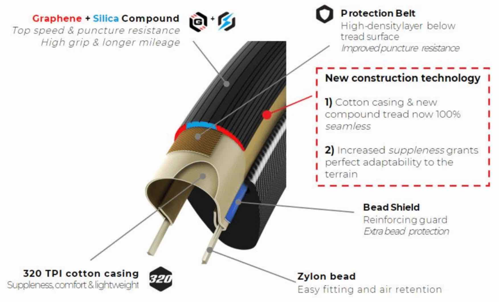 Vittoria non dorme sugli allori e rinnova il suo pneumatico più emblematico, che pure ha vinto un Tour de France. Rispetto alla versione precedente, il nuovo Corsa Pro (tubeless-ready e tubolare), offre maggiore velocità, maggiore aderenza in curva e sul bagnato, maggiore resistenza al rotolamento e comfort. Corsa PRO utilizza la mescola in grafene e silice, la più innovativa sviluppata da Vittoria e un nuovo processo di vulcanizzazione elettrica, che consente un’applicazione uniforme e continua del battistrada sulla carcassa.