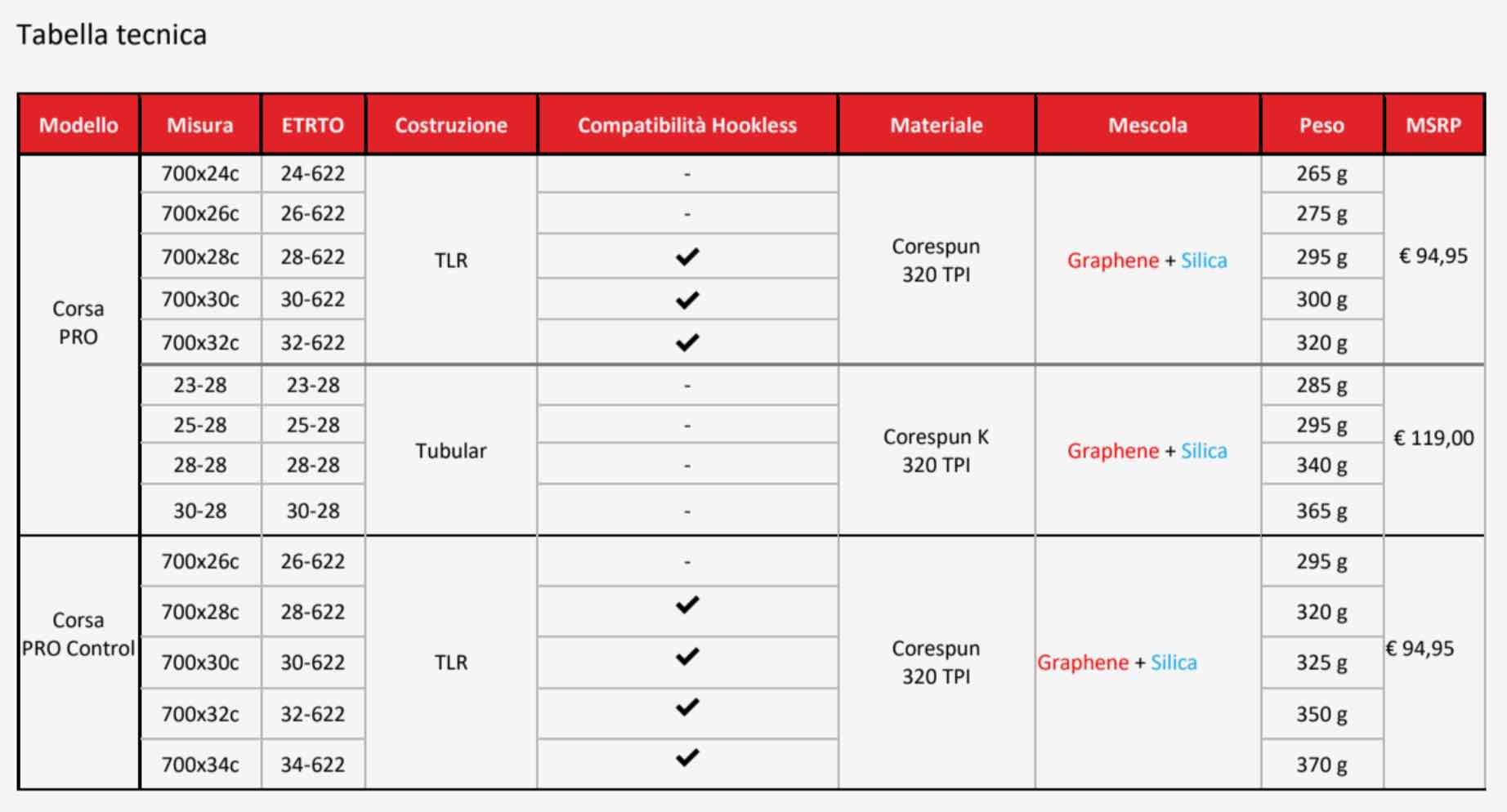 Entrambi i modelli sono disponibili in versione Tubeless-ready, compatibile anche con l’utilizzo di camera d’aria. Corsa PRO è disponibile anche in versione tubolare.