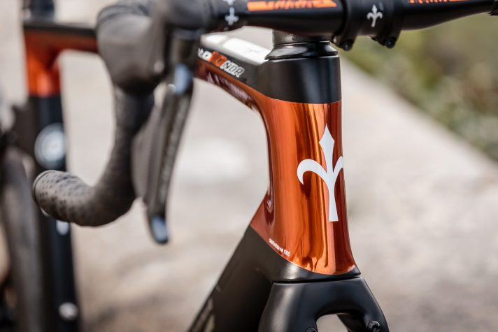 Dopo Cento10AIR e Cento10PRO, è la volta di Cento10NDR… Tocca infatti al modello di punta della categoria Endurace il privilegio di indossare il mitico “ramato”.Solo il top di gamma delle Wilier Triestina si può fregiare dell’inconfondibile colorazione che accompagna la storia del marchio italiano sin dagli anni anni ’40. Nella prima metà del secolo scorso, infatti, la finitura ramata rappresentava una tecnologia all’avanguardia ed era riservata alle “specialissime” in acciaio, tra cui la bicicletta con cui Fiorenzo Magni vinse il Giro d’Italia nel 1948.DALL’ACCIAIO ALLA FIBRA DI CARBONIONel 2016, Wilier ha deciso di recuperare questa icona appartenente all’era dell’acciaio e, grazie a un nuovo processo di verniciatura, è stato possibile replicare il colore ramato sui telai in fibra di carbonio. Come sulle biciclette in acciaio di un tempo, questo processo di verniciatura è un lavoro lungo, meticoloso e molto costoso. Gli speciali strati di vernice sono applicati a mano da artigiani e ogni fase della lavorazione deve essere eseguita con una precisione maniacale, così da raggiungere gli standard elevati da cui questa finitura non può prescindere.Rispetto alle altre due prime donne della collezione Wilier, su Cento10NDR il look ramato ha fatto un ulteriore passo avanti: oltre alla finitura del telaio, un piccolo tocco è stato aggiunto su Stemma e Barra (l’attacco manubrio con piega in carbonio monoscocca, con passaggio cavi integrato).