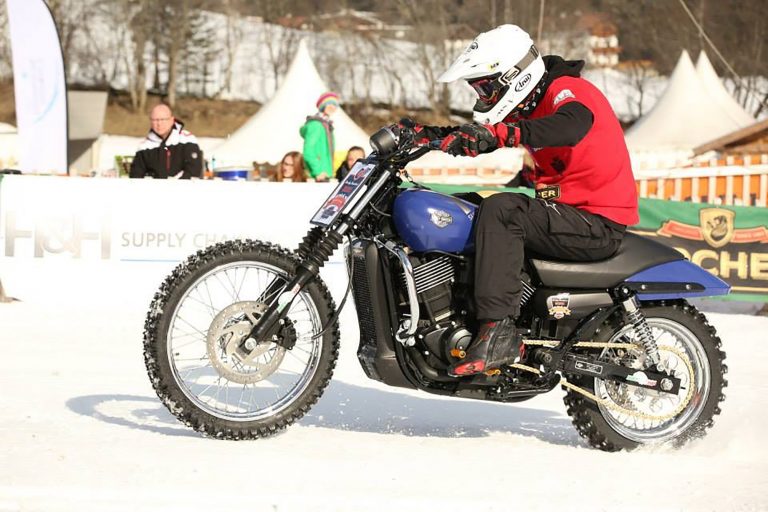 Red-Live team in gara con Alberto Cecotti a una hill climbing sulla neve in Alto Adige, in sella a una bellissima Harley-Davidson Street 750 preparata dalla concessionaria H-D di Bolzano/Innsbruck. Prima manche in testa, ma una sbandata in gara2 ha compromesso il risultato finale (terzo di classe)