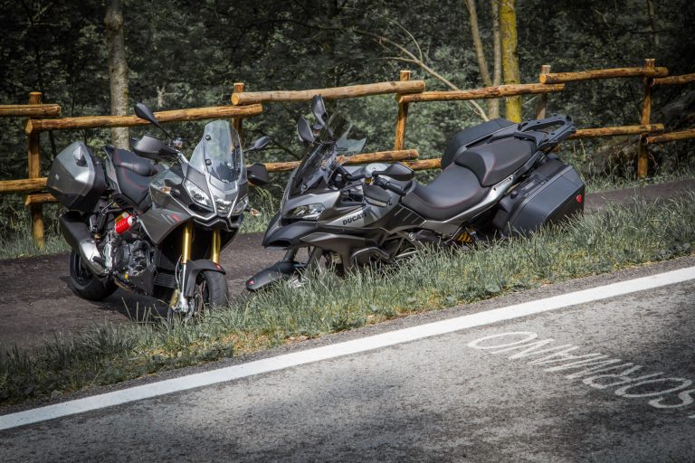 Italiane, e primatiste per quello che riguarda la tecnologia, Ducati Multistrada e Aprilia Caponord sono simili per destinazione ma diverse per indole: una, a sorpresa, è votata al turismo; l’altra si conferma sportiva vera. Anche i prezzi sono lontani