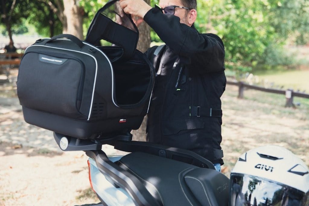 Il top-case Monokey semirigido T525 è un trasportino per animali da compagnia di piccola taglia, fino a 5 kg di peso. La dotazione tecnica comprende un cuscino interno imbottito lavabile, 2 tasche esterne porta oggetti più un taschino interno porta-documenti, e una cinghia per portare la borsa a tracolla, oltre a 3 maniglie ergonomiche per il trasporto a mano. Inclusi anche piastra e kit di fissaggio. La struttura semi-rigida del bauletto è realizzata in un mix di materiali tecnici. Le due comode aperture a conchiglia con zip e superiore a ribalta in rete permettono di far entrare e uscire la bestiola dalla borsa con facilità. Il sistema di aerazione si avvale di 4 prese d’aria laterali e un’apertura superiore arrotolabile, per aumentare la traspirabilità. Prezzo: 259 euro.