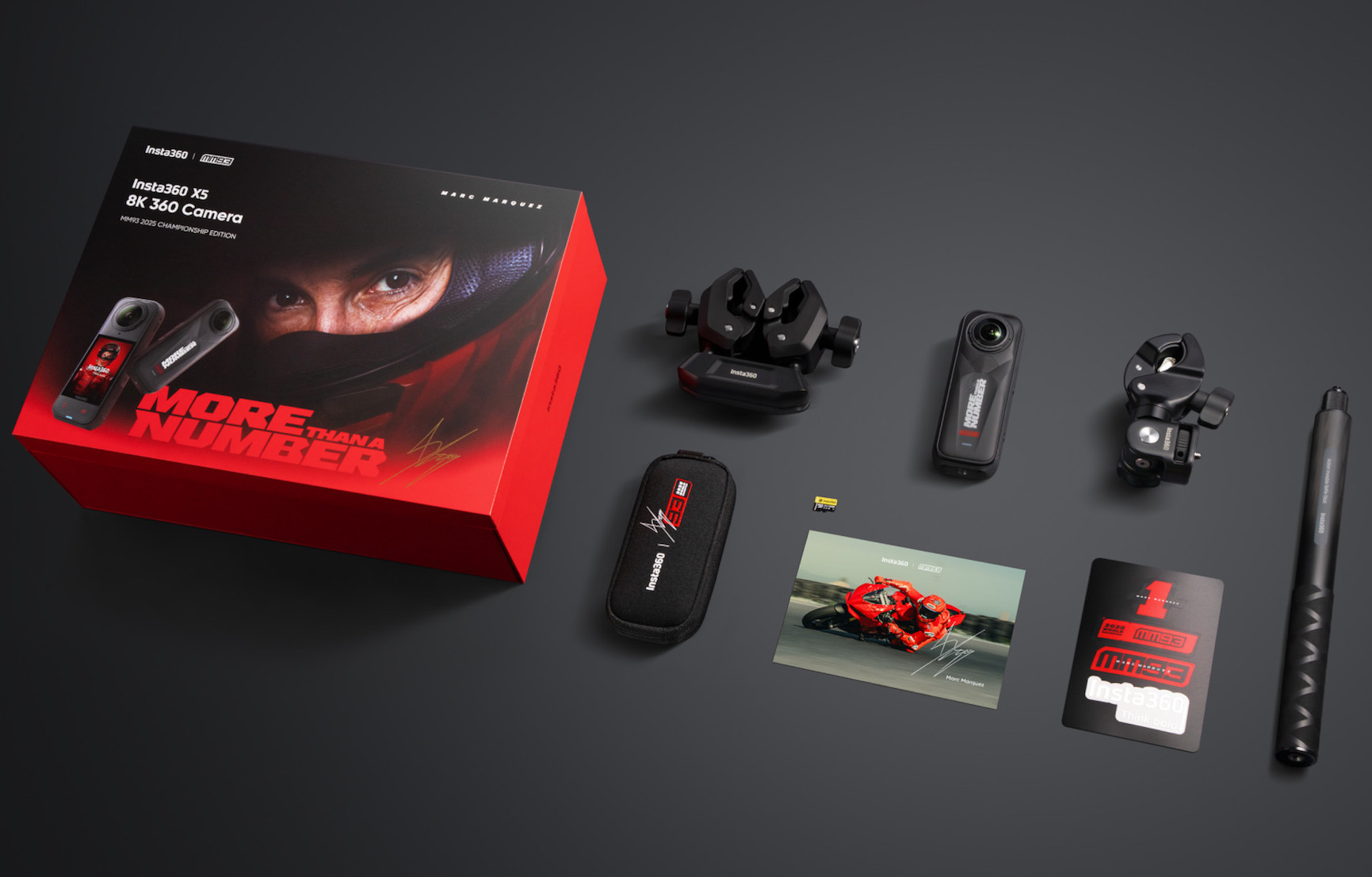 I dettagli esclusivi appannaggio di questo modello sono numerosi: la livrea dedicata con lo slogan “More Than a Number”, un’interfaccia di uscita personalizzata con il logo MM93, una custodia protettiva dedicata e un set di adesivi tematici. Non manca nella confezione un kit completo di accessori pensati per l’uso su moto, come una Heavy Duty Clamp e una Crab Clamp, che possono essere combinate e montate sulla moto per garantire un’eccellente stabilità anche ad alte velocità; gli Action Invisible Selfie Stick, per catturare riprese in terza persona e un scheda microSD da 128 GB, capace di contenere ore di filmati 360°. La X5 MM93 2025 Championship Edition, infine, è disponibile a 759 euro.