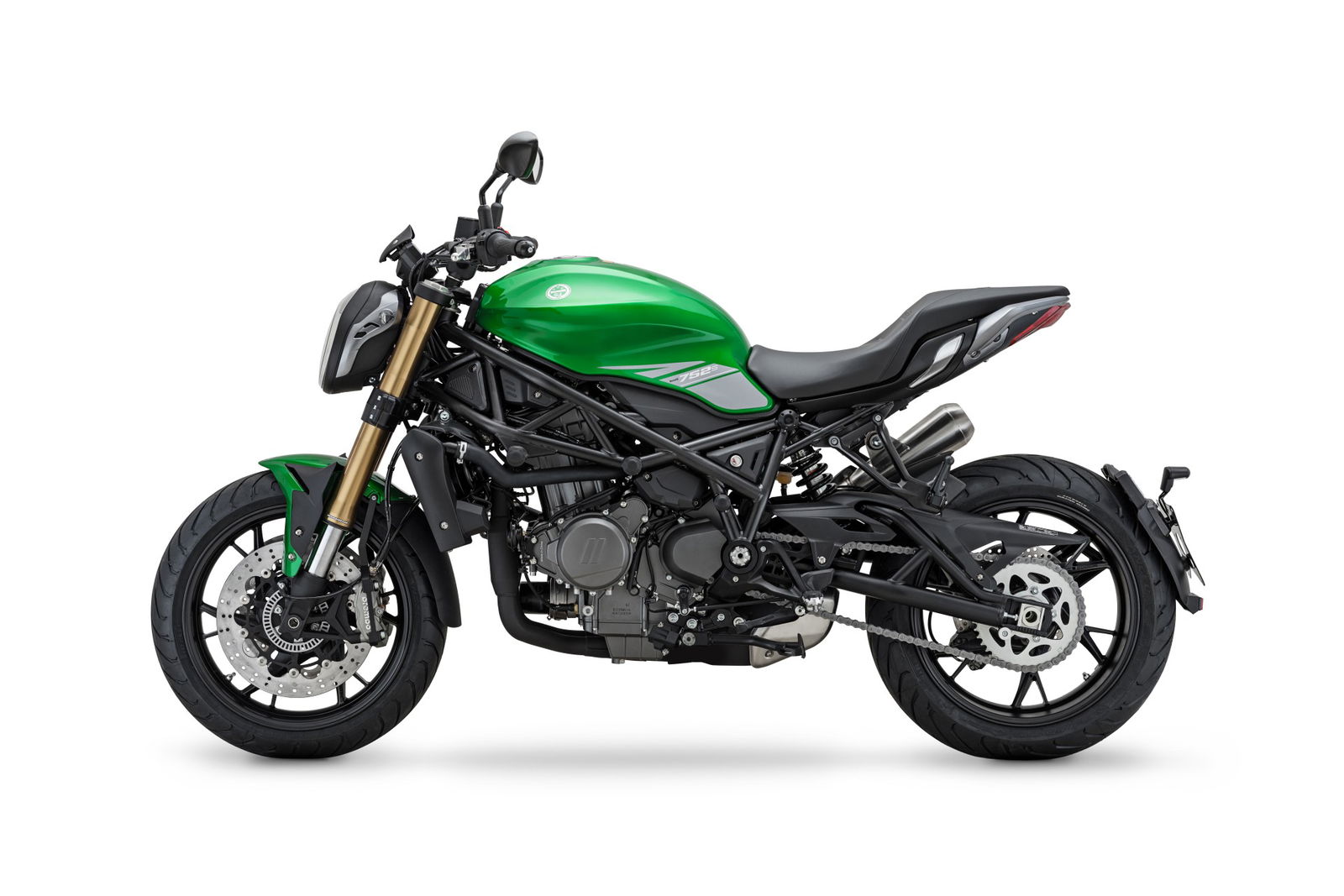 traliccio tubolare con piastre in acciaio, che abbraccia il nuovo bicilindrico Benelli, raffreddato a liquido, da 750 cc. La distribuzione è a doppio albero a camme in testa, 4 valvole per cilindro e alimentazione a iniezione elettronica, con doppio corpo farfallato. Potenza e coppia massima sono