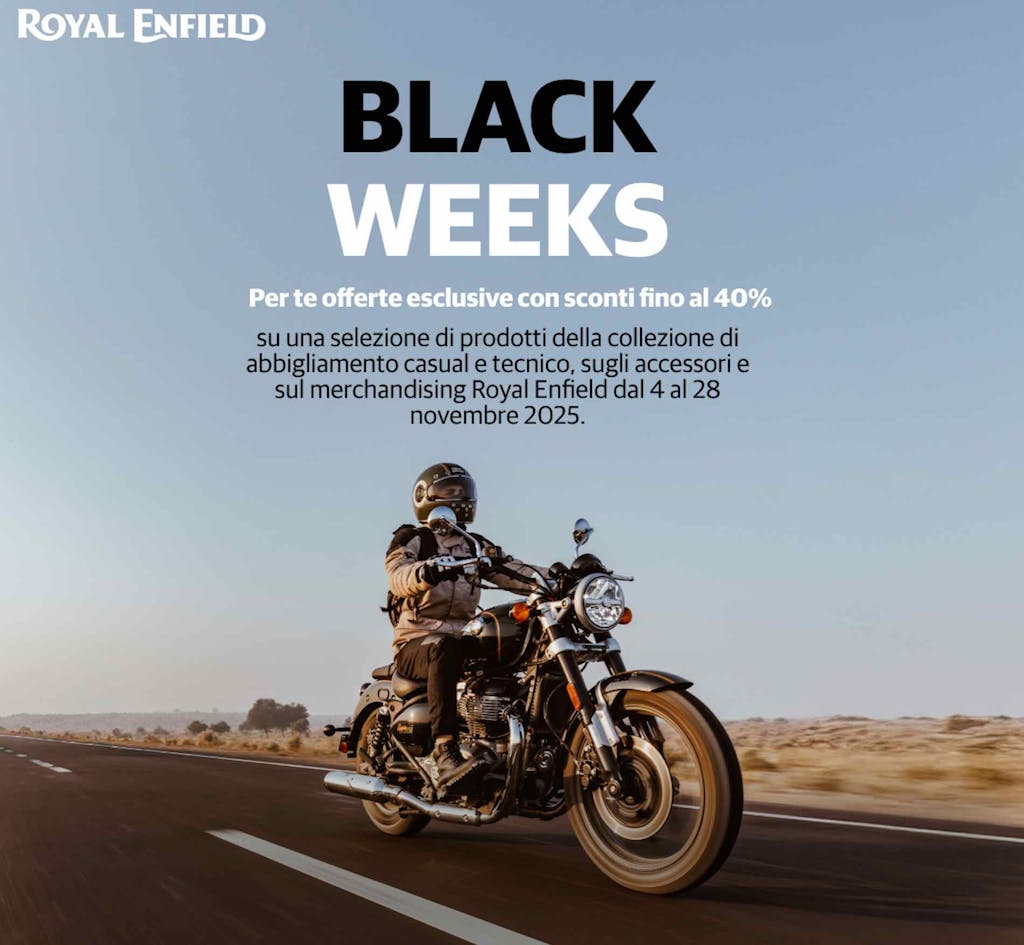 Le Black Weeks tornano a novembre. Dal 4 al 28, nelle concessionarie ufficiali Royal Enfield aderenti, sarà infatti possibile approfittare di promozioni fino al 40% su una selezione di articoli lifestyle, abbigliamento tecnico, accessori e kit di manutenzione.