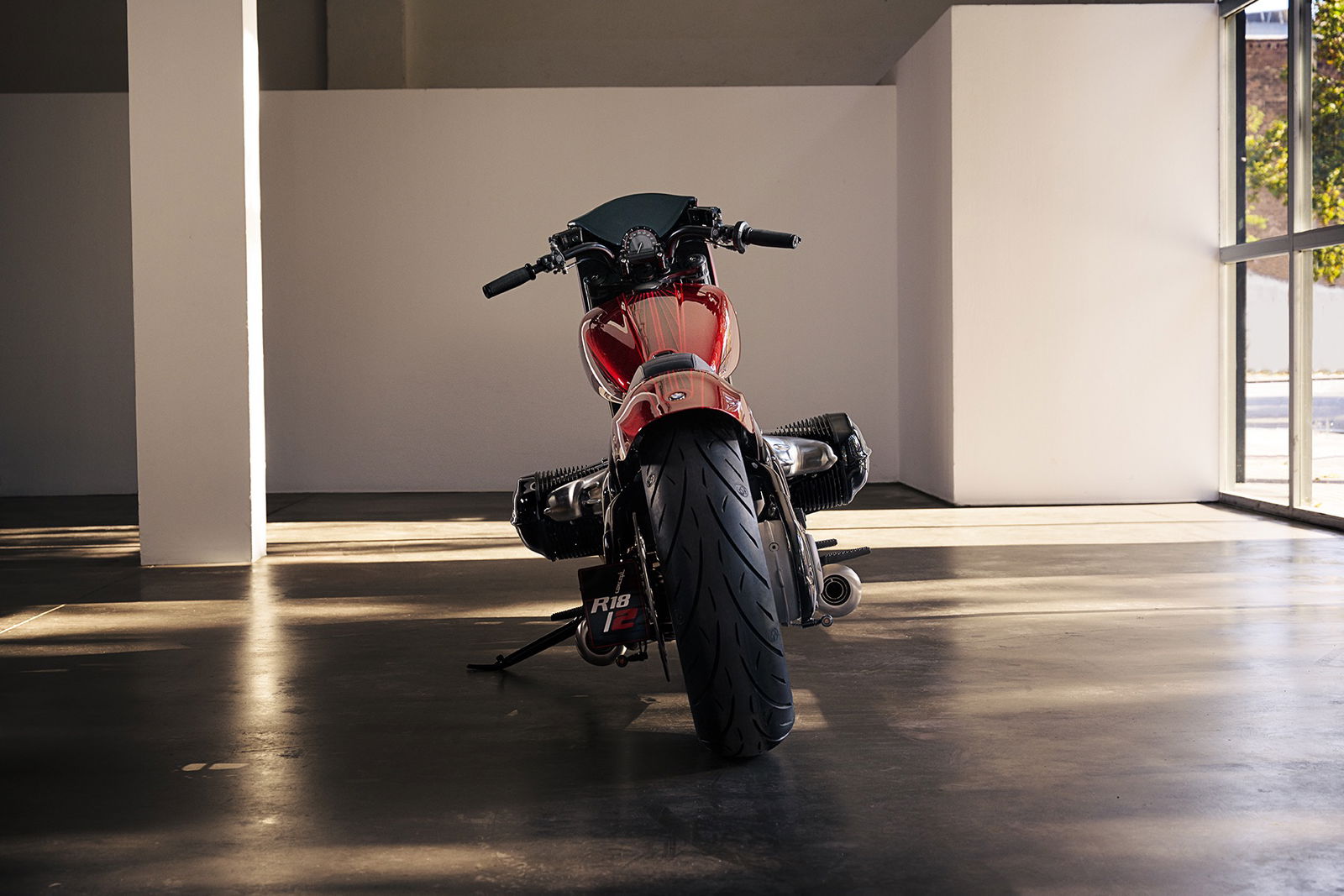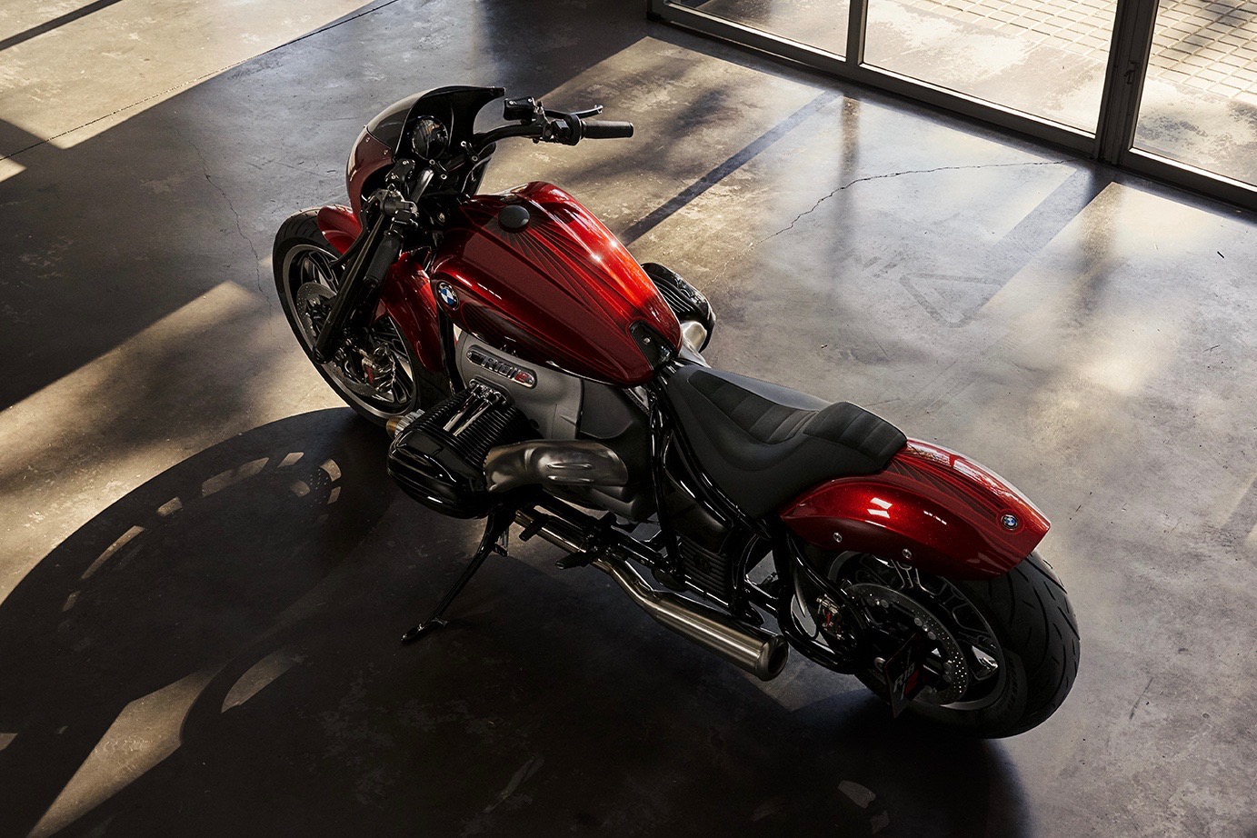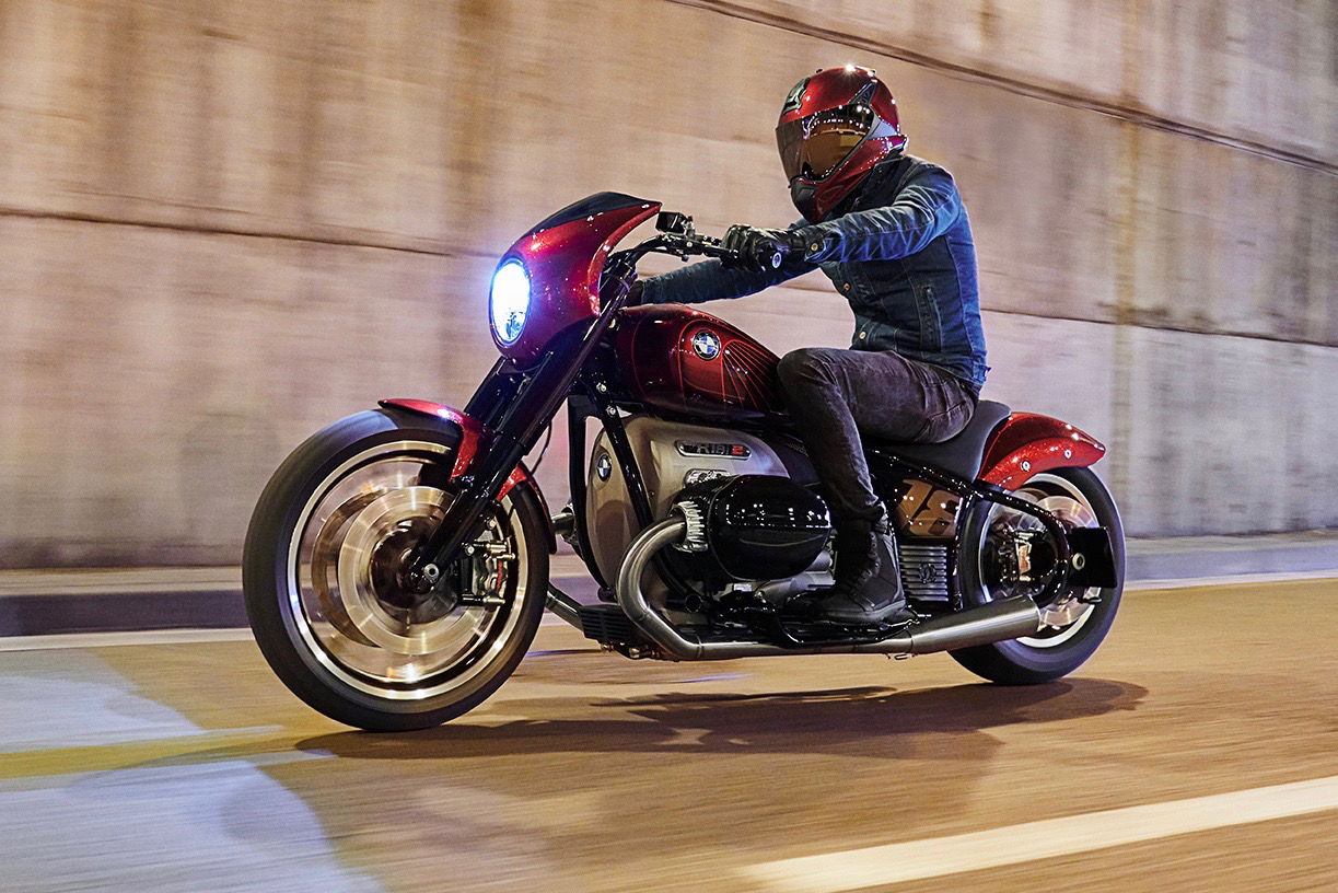 Al contrario dell’elegante R18, che puntava sul classico nero, la BMW Concept R18/2 sfoggia una sensuale livrea rossa metallizzata, movimentata da grafiche esclusive. Le forme sinuose del cupolino trovano continuità nel serbatoio a goccia e proseguono poi verso il massiccio parafango posteriore. Sotto di esso si trova una panciuta ruota da 16” mentre quella anteriore, più esile, è da 19”. Le sovrastrutture minimaliste lasciano in evidenza il telaio tubolare e il motore, che qui ha cilindri e teste verniciati di nero. Le finiture sono curate in modo maniacale e la componentistica è di pregio, con freni Brembo e uno scarico in acciaio Hattech.