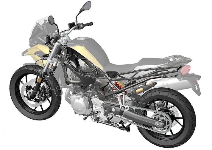 Il bicilindrico frontemarcia è abbracciato da un nuovo telaio in acciaio che sfrutta degli scatolati nella parte anteriore e una struttura tubolare in quella posteriore. La sua geometria è rivista e promette un miglioramento della precisione di guida. La forcella è tradizionale, con steli da 41 mm, e fa il paio con un robusto forcellone bibraccio, con il sistema ESA a stuzzicare la fantasia dei clienti più esigenti. Le ruote sono in lega e quella anteriore è da 19”, mentre quella posteriore è da 17”, gommate rispettivamente 110/80 e 150/70. Un’altra novità di spicco è rappresentata dal ritorno nei ranghi del serbatoio, che torna a stare tra il cannotto di sterzo e la sella e non sotto quest’ultima come accadeva in passato, per favorire una migliore distribuzione dei pesi.