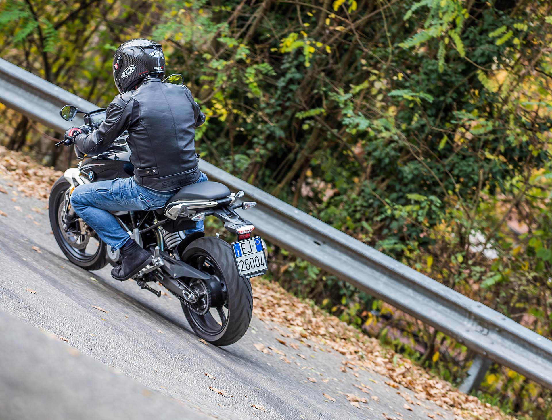 È piacevole anche scoprire che, in un toboga di curve, la BMW G 310 R diverte senza impegnare e dimostrandosi anche efficace. Le sospensioni sono tarate morbide ma sono molto equilibrate, permettendo alla piccola naked di Monaco di non sottosterzare. E quel feeling di cui abbiamo già parlato regala grande sicurezza e precisione. Ciclistica e assetto sono dunque i suoi punti di forza. Non è necessario calcolare la traiettoria perché basta mezzo secondo a gas chiuso per riportare la G 310 R nei ranghi, anche se si è entrati in curva troppo baldanzosi.
