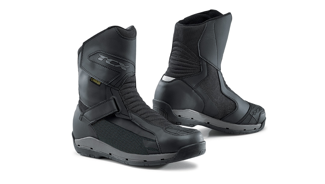 Il segmento “Touring Classic” è quello su cui il reparto R&D di TCX si è concentrato maggiormente, con l’introduzione in gamma del modello Airwire Gore-Tex Surround. Caratterizzato da una costruzione con taglio mid-cut è ideale non solo per chi percorre lunghe distanze in moto ma anche per chi si muove in città in sella a uno scooter indossando un paio di jeans. La suola ha battistrada in gomma antiscivolo a cui è accoppiata un’intersuola con inserto in PP che, oltre a garantire rigidità strutturale, si distingue per la presenza di una speciale griglia di ventilazione capace di incanalare l’umidità e il calore verso i fori posti lateralmente. La corretta temperatura del piede è garantita dal lavoro sinergico della suola, della tomaia e della membrana Gore-Tex Extended Comfort Footwear. Da segnalare il plantare in OrthoLite e i rinforzi nei punti più critici, come malleolo, tibia, punta e tallone. Disponibile nella sola versione Black, Airwire Gore-Tex Surround è offerto nelle taglie che vanno dalla 38 alla 48.