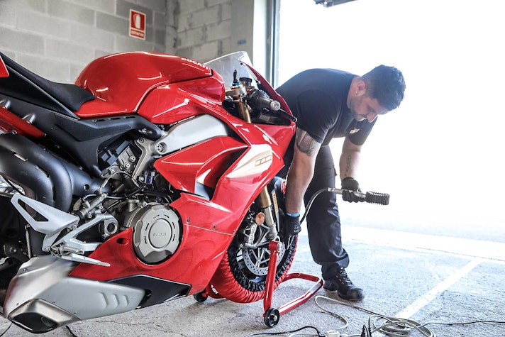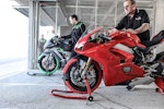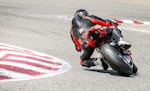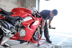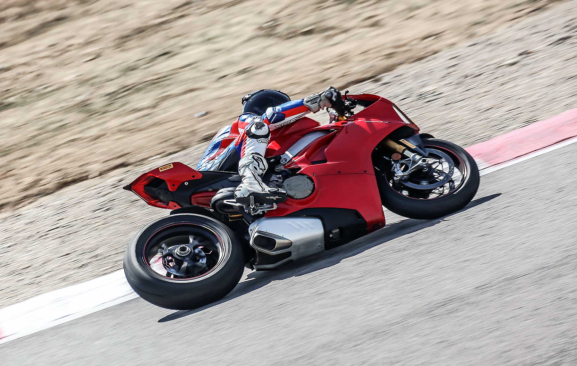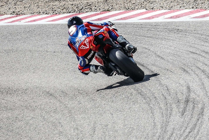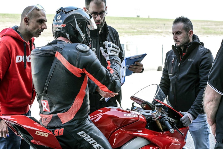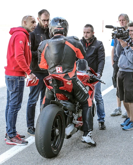 Con lei si ha sempre l’impressione che l’avantreno resti un po’ “alto” (sembrava lo stesso con la 1299) però quanto l’aggredisci tutto va a posto. Più facile della 1299? Sì. Ma non è una moto per mammolette, non la devi guidare “morbido”, quando cerchi il tempo ha così tanta birra che ci vogliono fisico in forma e mente lucida. Se inizi a stancarti e di fai portare in giro dalla moto, è meglio che ti fermi e la fai raffreddare un po’, anche perché la V4 scalda parecchio. Un po’ in sofferenza inizialmente nelle buche a causa della sua grande rigidità, la V4 ha poi trovato la via verso un ottimo assetto grazie all’intervento dei tecnici Ducati presenti alla prova migliorando in modo sensibile la delicata fase di percorrenza a gas in mano su fondo sconnesso e offrendo la necessaria fiducia per accelerare presto, soprattutto con le collose SC1.