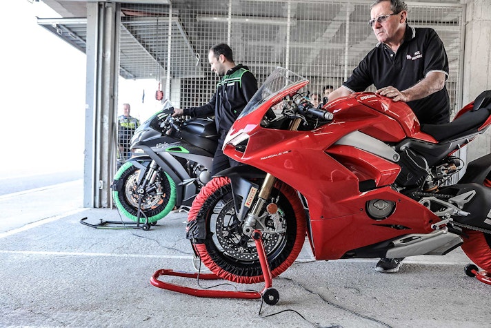 Un balzo in avanti che si fa sentire anche quando a moto piegata e gas aperto si innesta il rapporto successivo. Il quick shifter in salita, infatti, è tutt’altro che veloce (lo avevo notato anche a nel test di Valencia) e quando si è a moto piegata la “botta” sporca la linea e fa perdere decimi preziosi. La teoria vorrebbe che si spalanchi il gas e si lasci fare all’elettronica, lei va guidata così, ma con certe prestazioni la teoria sono in pochi a metterla in pratica. Però come a scuola basta mettersi sotto e… studiare. Inoltre, a memoria, ricordo la versione con lo scarico aperto più lineare nell’erogazione e quindi più gestibile anche se ancora più potente. I vincoli dell’Euro 4 tolgono linearità ai motori e Ducati sembra accusare leggermente più delle altre queste briglie omologative.Che per sfruttarla a fondo serva un pilota con il pedegree è un fatto assodato, una volta aggredita e presa la mano con un’elettronica di livello superiore (ci si deve fidare, ma per arrivare li, ci vuole un po’ di tempo) il potenziale di questa moto è altissimo e probabilmente ancora inesplorato dai più.La Ducati Panigale V4 S sotto la lente ad AlcarrasEquipaggiamentoTutto di seriePeso rilevato con pieno200 kgDistribuzione dei pesi ant/post108,2/91,9 kg 54,1% – 45,9%Riding ModeRACERisposta MotoreMediumDTC2ABS1 (front cornering)DWC2DSC (slide control)1EBC (freno motore)offTempo medio R11.37.920Tempo medio R21.40.412Miglior tempo assoluto1.37.539Tempo medio totale1.39.166Media voti tester9,37