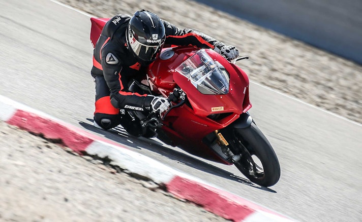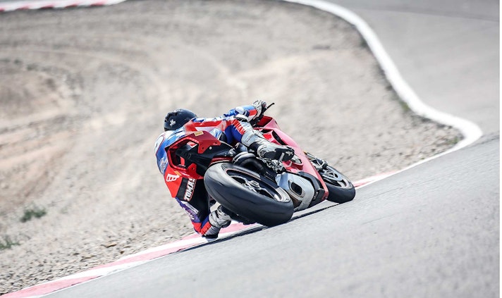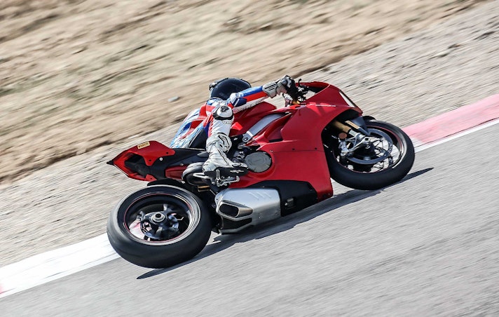 La fuori quota del gruppo è anche l’ultima arrivata sul mercato. Il suo motore Desmodromico V4 ha una cilindrata di 1.103 cc, ottimale secondo Ducati per garantire non solo potenza ma anche guidabilità e coppia. E di potenza ce n’è una marea sulla Panigale V4. 214 cv a 13.000 giri con una coppia di 124 Nm a 10.000 giri. Segni particolari? Quasi tutti, il motore ha scoppi Twin Pulse per assomigliare a un bicilindrico l’albero motore è controrotante come quello delle MotoGP, il telaio “front frame” è collegato direttamente al motore, l’ABS ha funzione cornering anche con mappatura Race e gestisce lo scivolamento in ingresso curva. Nemmeno le gomme sono normali con il posteriore da ben 200/60 che ha solo lei. Per lei sospensioni semiattive Ohlins. I suoi numeri 1469 mm di interasse 100 mm di avancorsa e 24,5° di inclinazione cannotto. Tutto per 198 kg in ordine di marcia.RIDESe siete in cerca di emozioni forti, beh la Panigale V4 è sicuramente la moto che fa per voi. La nuova opera di Ducati porta all’estremo, evolvendoli e raffinandoli, molti concetti che già abitavano sulla 1299, distaccandosene però in modo perentorio. Una premessa personale di chi scrive: per me la V4 è la Ducati sportiva più esaltante da guidare che io abbia mai provato (considerando che sono partito con la 851…) un purosangue strapotente e viscerale.