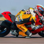 In una comparativa in cui il time attack si compone di due soli giri e i tester saltano da una moto all’altra, la Panigale V4 richiede un minimo di assuefazione in più rispetto alle altre. Devi resettare tutti i riferimenti, la posizione di guida è unica, i manubri apertissimi e alti, il serbatoio superslim (per qualcuno troppo, tanto che Ducati ci ha messo a disposizione una moto con due “pad” in gomma per migliorare il grip in staccata e guadagnare qualche millimetro di larghezza). La rapportatura completamente differente dalle altre impone che si utilizzino marce diverse lungo tutto il circuito. Dove con le altre usi la prima qui usi la seconda, dove con le altre usi la seconda passi alla terza; alcune curve, invece, si affrontano con la stessa marcia.