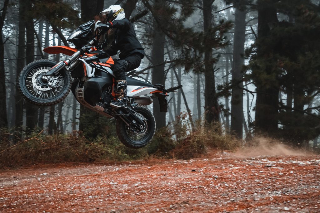 Estetica unica nel suo genere (ma rivista per il 2023, la base però cambia poco), ha soluzioni tecniche “scontate” per fare al meglio l’off-road con una grossa cilindrata. Motore bicilindrico parallelo da 889 cc, 105 cavalli e 100 Nm di coppia. Il telaio in tubi d’acciaio al pari delle sospensioni WP si confermano elementi imprescindibili parlando di KTM cui aggiungo con piacere che la presenza del serbatoio posizionato in basso che rende la guida tra le più efficaci non solo in condizioni di bassa aderenza. Nonostante la posizione di guida – in piedi sulle pedane – poco naturale soprattutto per la posizione del manubrio decisamente bassa, il feeling trasmesso è ottimo. I palmi delle mani contano il singolo sasso che passa sotto i tasselli degli pneumatici, l’avantreno dialoga già da velocità zero e non ti tradisce nemmeno quando aggredisci una curva stretta con la leva del freno anteriore stretta tra le dita.