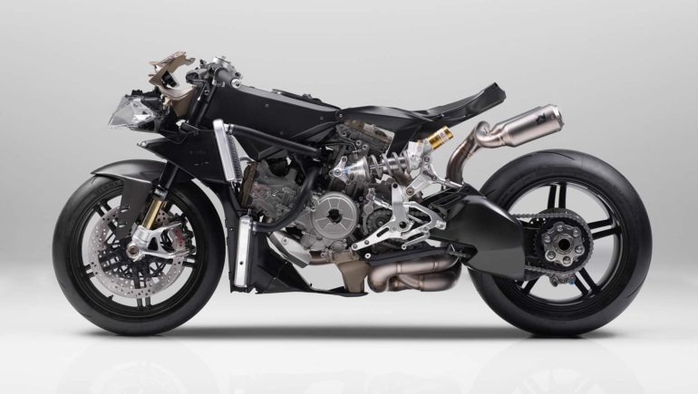 Nonostante le recenti vittorie di Chaz Davies, la Panigale non sarà certo ricordata come la più titolata delle Superbike progettate e costruite a Bologna. Di sicuro, però, è una delle più belle. E ora, alleggerita e potenziata in questa incredibile edizione Superleggera, anche la più potente, veloce e tecnologica di sempre. I numeri, del resto, sono eclatanti: 156 kg di peso dichiarato a secco, 215 cv di potenza – 220 con il kit pista che include lo scarico completo racing Akrapovic – e 14,9 kgm di coppia. In più tutta l’elettronica possibile e immaginabile.Il telaio fa ampio ricorso alla fibra di carbonio: in questo modo la struttura principale in composito con inserti in lega di alluminio 7075 pesa 1,7 kg meno rispetto alla 1299 Panigale (-40%). Risparmio di 900 grammi (-18%) per il monobraccio e di 1,4 kg per i cerchi, anch’essi in fibra di carbonio invece che in alluminio forgiato; la riduzione dell’inerzia di rotolamento è calcolata nel 26% anteriore e nel 44% posteriore. Fibra di carbonio anche per il telaio di supporto della sella, la carenatura, i parafango e la struttura che impedisce il contatto con i collettori di scarico. La ciclistica si avvale di unità regolabili di produzione Ohlins: la forcella FL936 con steli di 43 mm di diametro pesa 1,35 kg meno di quella, già leggera e raffinata, della 1299 Panigale; la molla in titanio dell’ammortizzatore TTX36 permette di risparmiare altri 500 grammi. L’impianto frenante Brembo con dischi di 330 mm di diametro e pinze monoblocco M50 utilizza nuove pastiglie freno.Il motore è l’evoluzione più significativa del bicilindrico Superquadro, che si spinge fino a 11.ooo giri per ottenere la potenza massima dichiarata di 215 cv. Rispetto alla 1299 Panigale ci sono 10 cv in più (+4,9%) e 0,2 kgm (+1,5%). Molti gli interventi, innanzitutto per alleggerire vari componenti: l’albero motore, con perno di biella maggiorato; le stesse bielle, in titanio, e i pistoni da 116 mm di diametro con due segmenti, come sui motori schierati nel Mondiale Superbike. Le canne dei cilindri sono in alluminio invece che in acciaio, e anche il volano è stato alleggerito, con una cura dimagrante che vale in totale 2,4 kg (-21,5%) rispetto al motore della Panigale. A ridimensionare leggermente questo risultato concorrono i basamenti, irrobustiti per via delle prestazioni superiori e ora realizzati per fusione in sabbia. Cambiano le valvole, in Titanio e di dimensioni maggiorate: da 46,8 a 48 mm (aspirazione), e da 38,2 a 39,5 mm, con alberi a camme che permettono maggiore alzata. Modifiche anche per i condotti di aspirazione e scarico, nonché per i cornetti, di dimensioni diverse per le due bancate. L’impianto di scarico completo è Akrapovic, con doppio terminale alto proprio come sulle Panigale ufficiali. Quello incluso nel kit pista vale ulteriori 5 cv ed è più leggero di ben 4. kg.