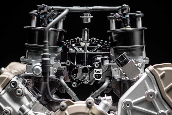I numeri di questo V4 Desmo sono molto interessanti: oltre ai già citati 210 cv erogati a 13.000 giri ricordiamo il regime massimo di 14.000 giri e la coppia massima di 120 Nm da 8.750 a 12.500 giri. Dato curioso: di solito c’è solo un picco mentre qui ci sono 4.000 giri in cui il motore eroga la coppia massima. Il peso è di soli 64,9 kg – solo 2,2 in più del Bicilindrico 1299, limite ottenuto grazie al largo utilizzo del magnesio -, mentre i corpi farfallati ovali con diametro equivalente di 52 mm respirano attraverso un airbox da ben 12,8 litri, praticamente una damigiana. Altre caratteristica interessante del motore Desmosedici Stradale è l’albero motore controrotante, soluzione ormai quasi universalmente utilizzata in MotoGP (e da MV Agusta per il suo tre cilindri di serie), che aiuta le inerzie “contrarie” nella gestione della moto in ogni situazione di guida. Svantaggi? L’adozione di un ingranaggio intermedio che “inverta” il moto prima di passarlo al cambio, che provoca un minimo assorbimento di potenza. Se però in MotoGP lo usano tutti è evidente che i vantaggi siano nettamente superiori rispetto agli svantaggi.I cornetti di aspirazione (altra primizia per Ducati) sono ad altezza variabile e sfruttano due iniettori di cui uno a doccia, mentre la lubrificazione è a carter semisecco per contenere gli ingombri. Fa bene Ducati a celebrare la nascita di questo V4: non solo un cuore nuovo per le sue supersportive del futuro ma una pietra miliare nella produzione motoristica di Borgo Panigale. È anche un bellissimo esercizio di ingegneria. Dopo questa Overture non vediamo l’ora di vederlo… all’Opera.