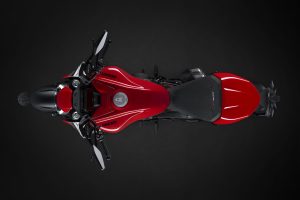 La moto è tutta nuova per lei arriva un inedito monoscocca anteriore, il motore è portante e al V4 si attacca il chilometrico e scenografico monobraccio a cui è collegata una non meno scenografica ruota posteriore con pneumatico da 240 mm.