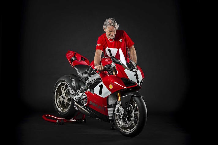 Anche il telaio non è stato risparmiato dalla cura 25° Anniversario. La struttura “front frame” è la stessa che utilizza la V4 R e si differenzia per gli alleggerimenti sulle fiancate realizzati di lavorazione meccanica, che consentono di ridurne ulteriormente il peso e di raggiungere i target di rigidezza richiesti da Ducati Corse. La forcella è una Öhlins NIX-30, il monoammortizzatore posteriore un Öhlins TTX36 e l’ammortizzatore di sterzo sempre Öhlins. Tutto è gestito dal sistema di controllo Öhlins Smart EC 2.0.