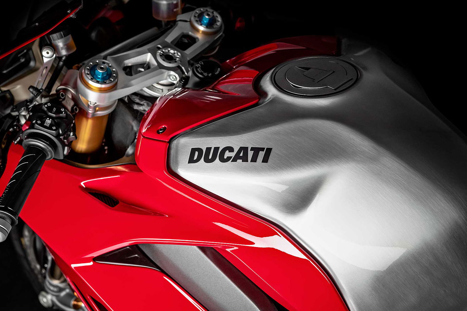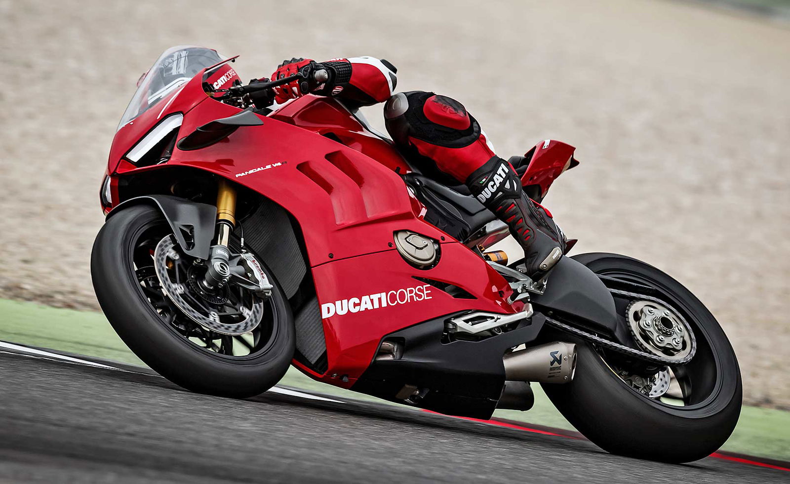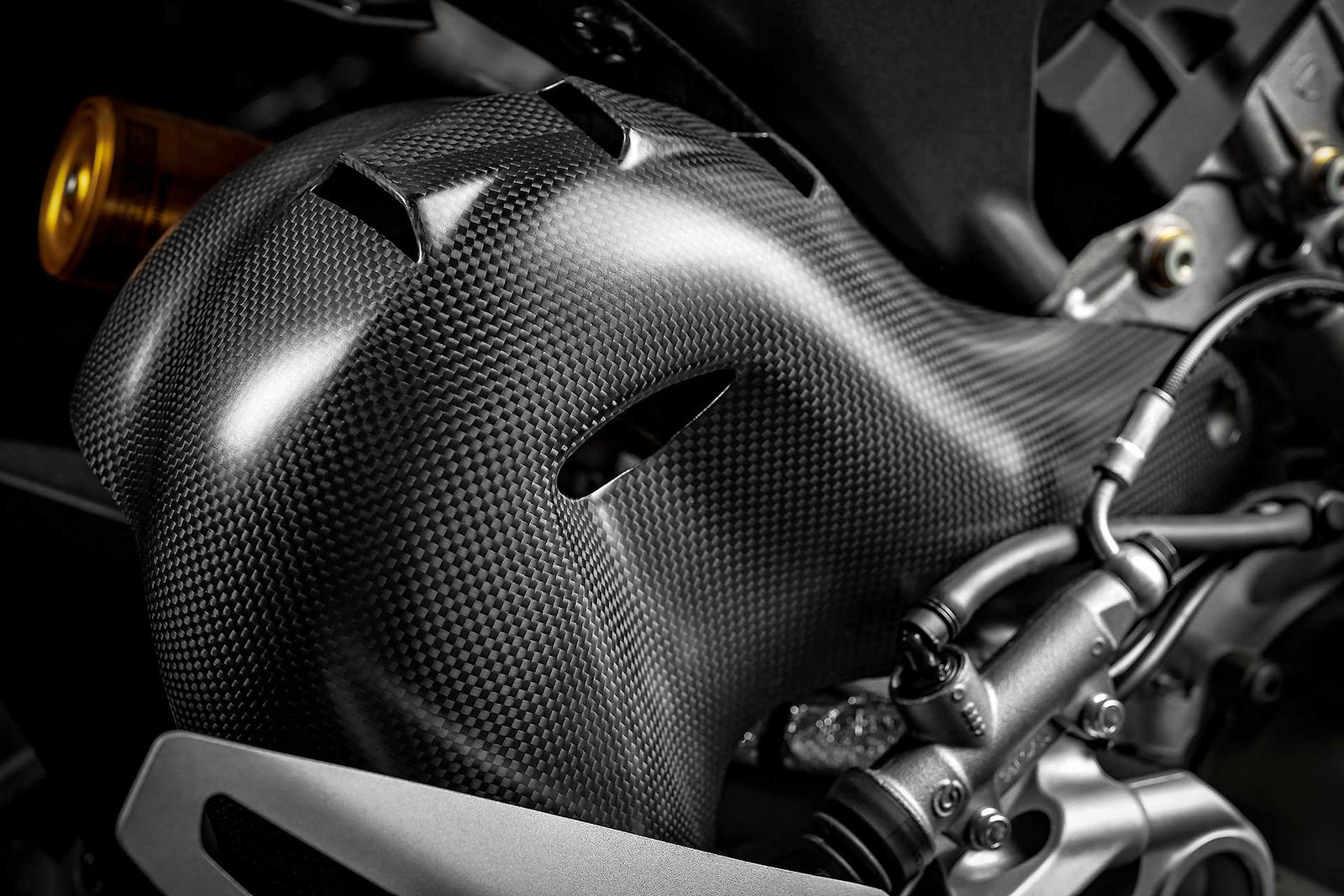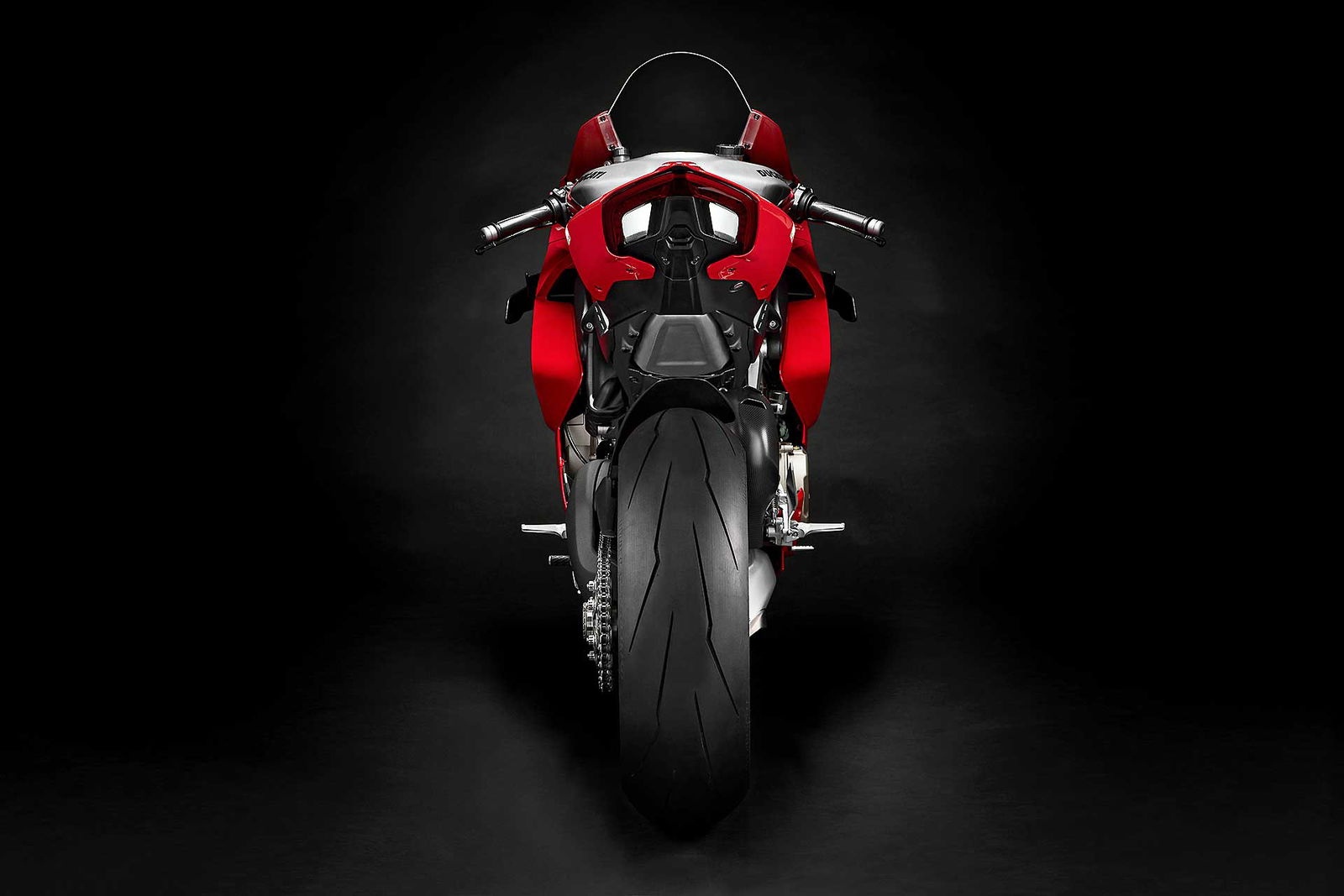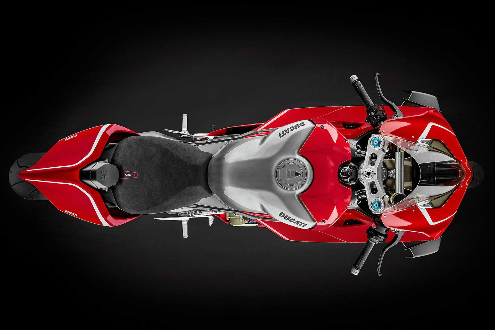 Il V4 è stato ovviamente oggetto di pesanti modifiche: invariato l’alesaggio di 81 mm, si accorcia la corsa (ora 48,4 mm) per aumentare il regime di rotazione fino allo stratosferico limite di 16.000 giri (16.500 in sesta). L’albero motore (sempre controrotante) è ora forgiato e pesa ben 1,1 kg in meno rispetto a quello della S, le bielle sono in titanio e consentono di risparmiare 100 grammi l’una, i pistoni monofascia sono stampati e le valvole di aspirazione sono in titanio. Inedite le teste con condotti di aspirazione maggiorati. La respirazione è stata ovviamente adeguata alle nuove richieste del motore, adottando corpi farfallati ovali di diametro maggiorato (56 mm equivalenti) e un filtro aria dedicato. Il motore della V4 R pesa 2 kg in meno rispetto al V4 della S. E a limitare il peso complessivo arriva la trasmissione racing con catena passo 520. Le reali potenzialità del V4 Ducati sono ben chiare quando si eliminano i catalizzatori per montare lo scarico Akrapovic con mappatura dedicata, ottenendo una configurazione da 234 cv di potenza a 15.500 giri.