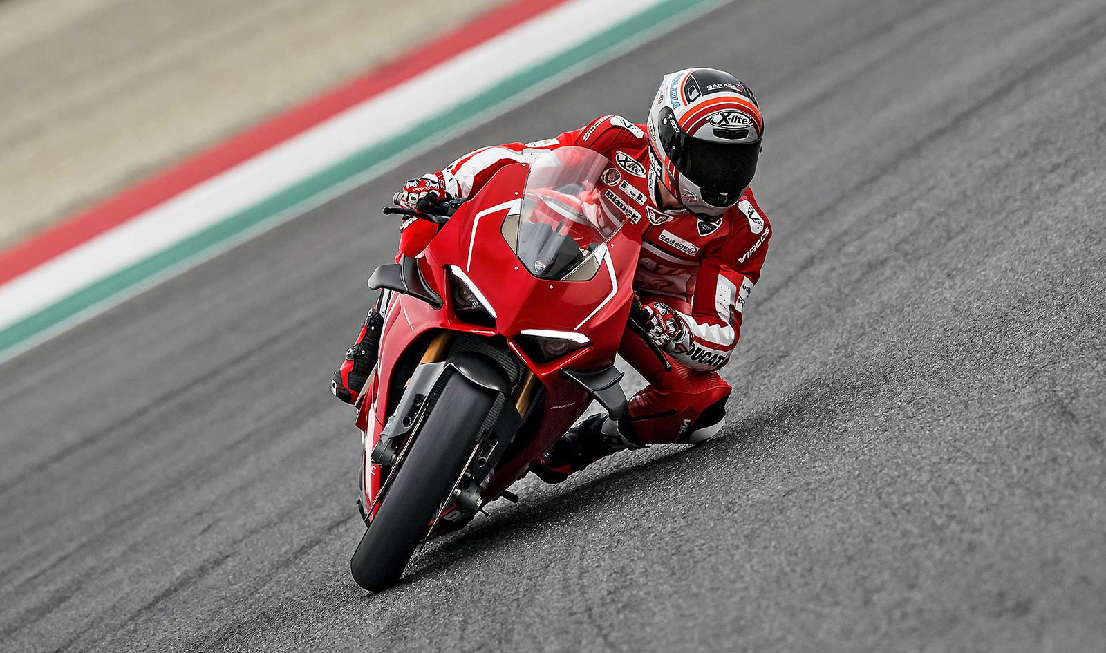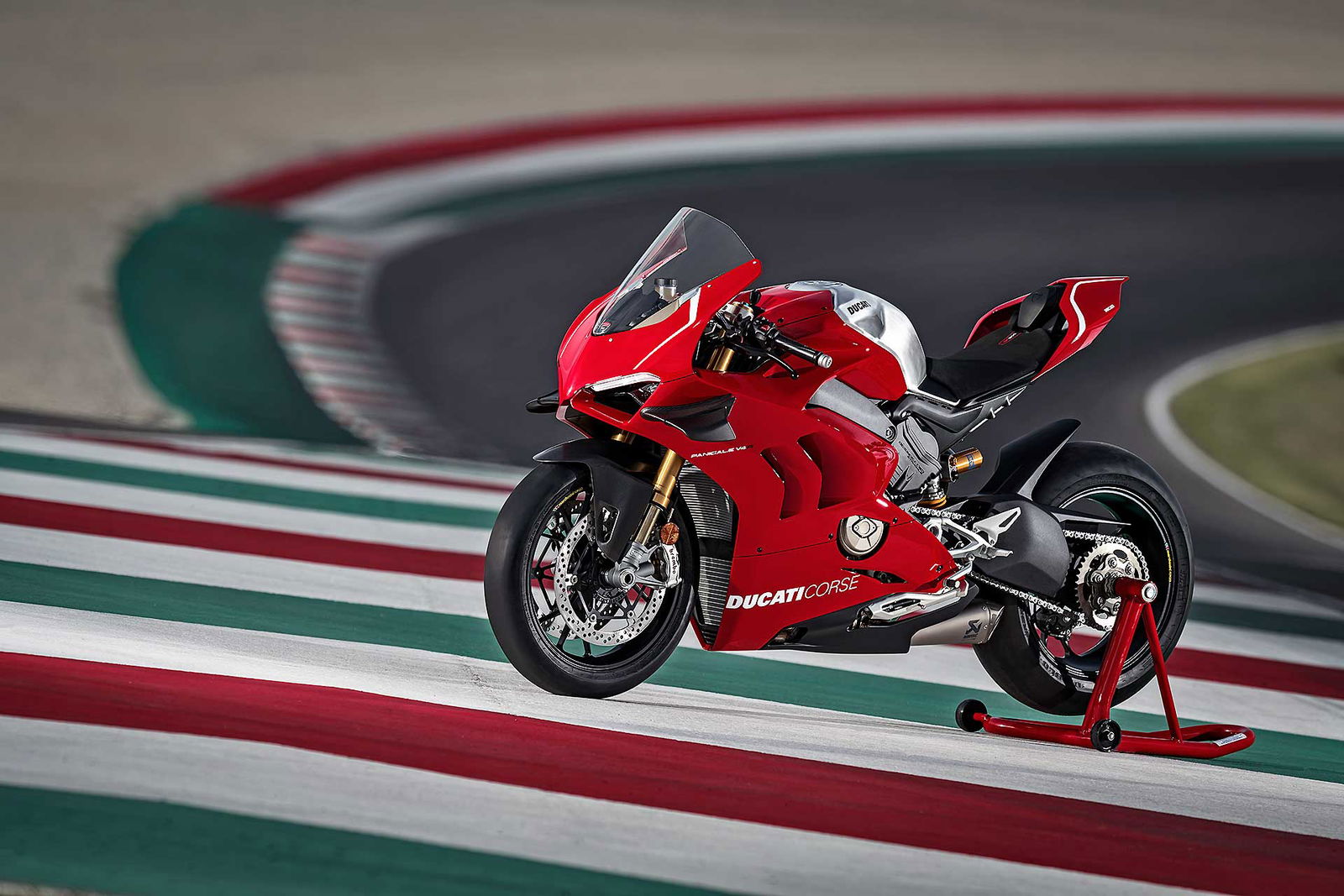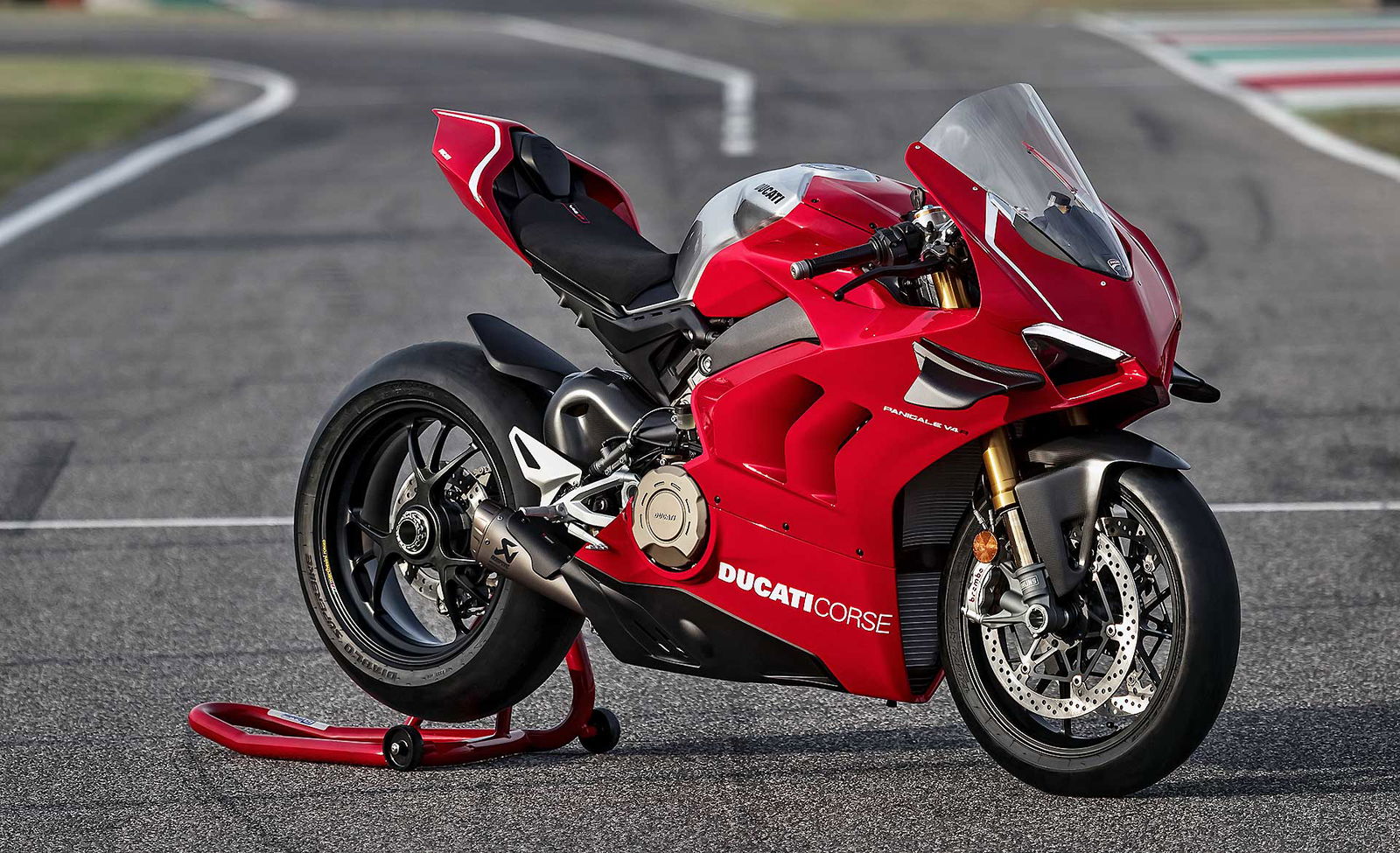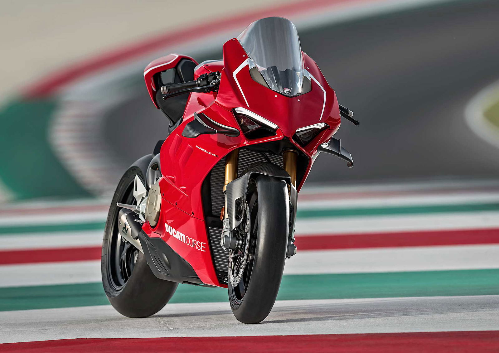 Il V4 è stato ovviamente oggetto di pesanti modifiche: invariato l’alesaggio di 81 mm, si accorcia la corsa (ora 48,4 mm) per aumentare il regime di rotazione fino allo stratosferico limite di 16.000 giri (16.500 in sesta). L’albero motore (sempre controrotante) è ora forgiato e pesa ben 1,1 kg in meno rispetto a quello della S, le bielle sono in titanio e consentono di risparmiare 100 grammi l’una, i pistoni monofascia sono stampati e le valvole di aspirazione sono in titanio. Inedite le teste con condotti di aspirazione maggiorati. La respirazione è stata ovviamente adeguata alle nuove richieste del motore, adottando corpi farfallati ovali di diametro maggiorato (56 mm equivalenti) e un filtro aria dedicato. Il motore della V4 R pesa 2 kg in meno rispetto al V4 della S. E a limitare il peso complessivo arriva la trasmissione racing con catena passo 520. Le reali potenzialità del V4 Ducati sono ben chiare quando si eliminano i catalizzatori per montare lo scarico Akrapovic con mappatura dedicata, ottenendo una configurazione da 234 cv di potenza a 15.500 giri.