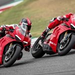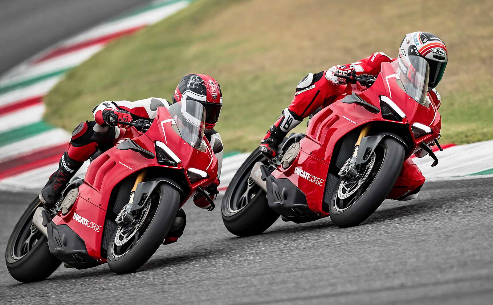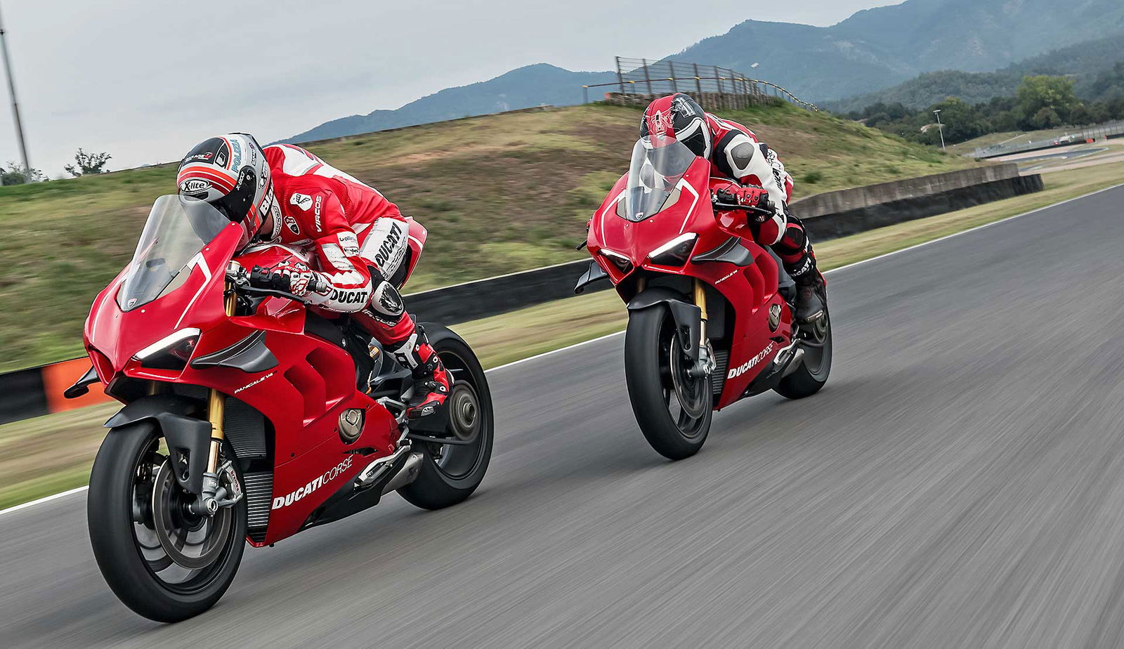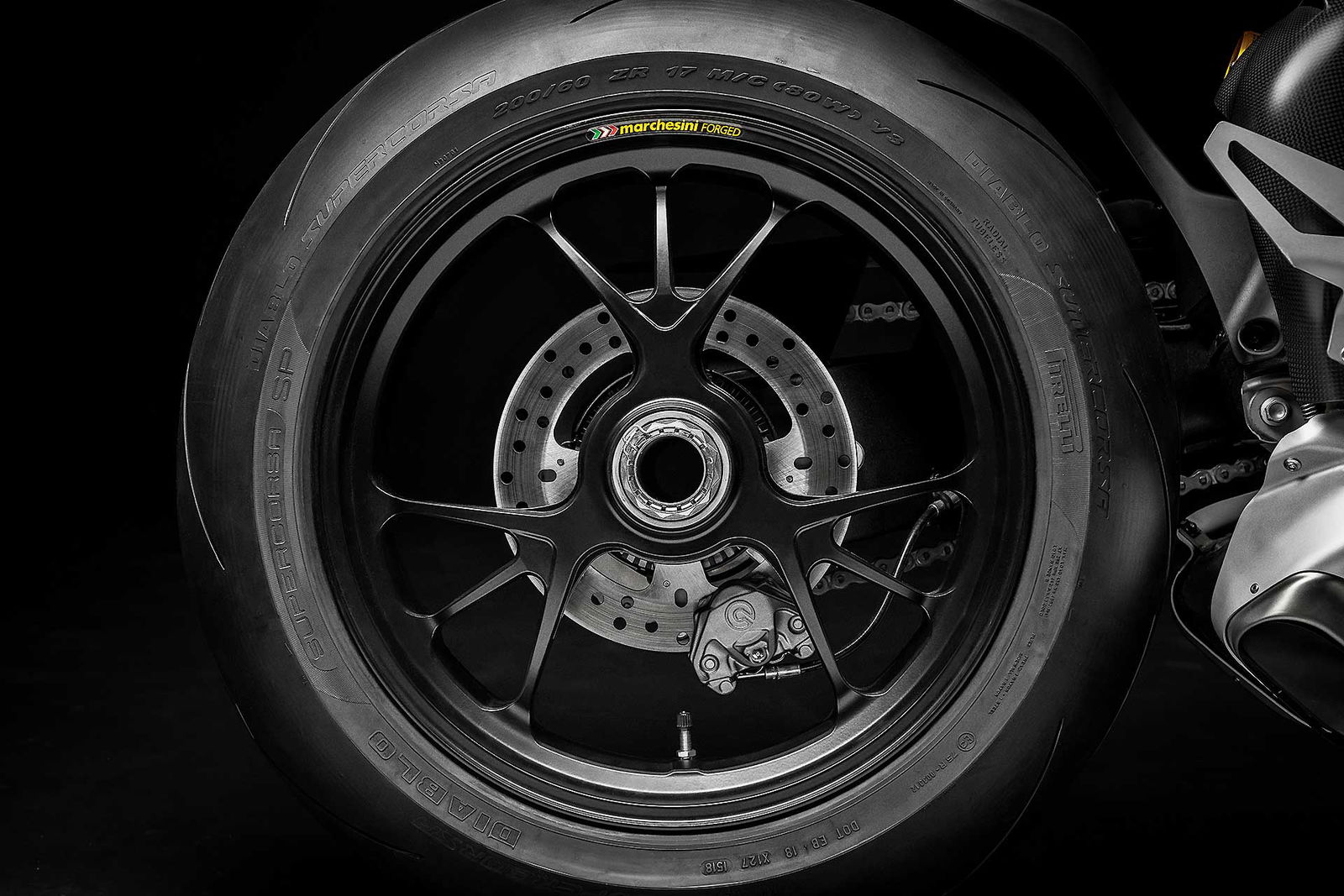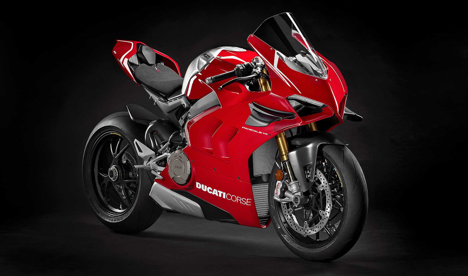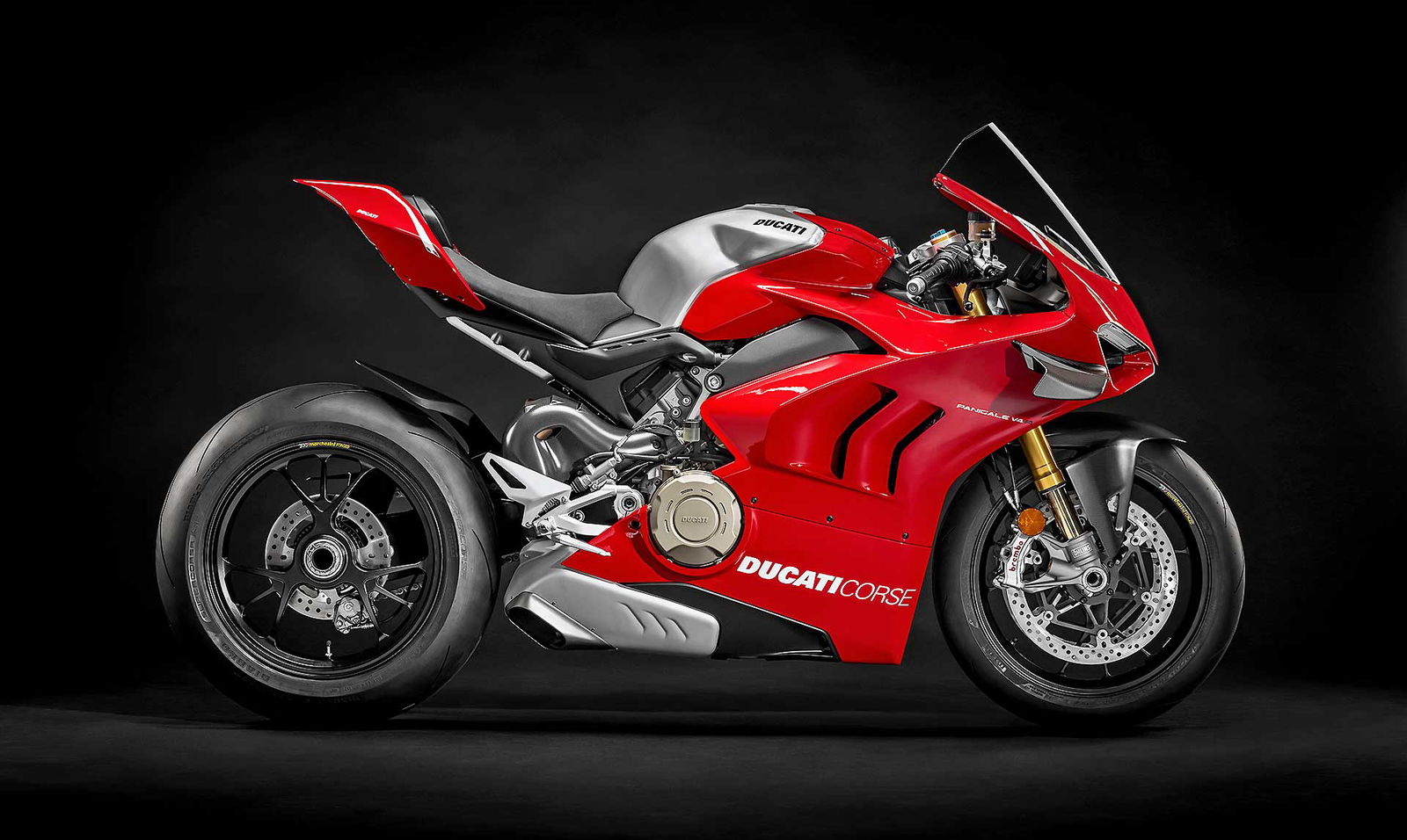 Il V4 è stato ovviamente oggetto di pesanti modifiche: invariato l’alesaggio di 81 mm, si accorcia la corsa (ora 48,4 mm) per aumentare il regime di rotazione fino allo stratosferico limite di 16.000 giri (16.500 in sesta). L’albero motore (sempre controrotante) è ora forgiato e pesa ben 1,1 kg in meno rispetto a quello della S, le bielle sono in titanio e consentono di risparmiare 100 grammi l’una, i pistoni monofascia sono stampati e le valvole di aspirazione sono in titanio. Inedite le teste con condotti di aspirazione maggiorati. La respirazione è stata ovviamente adeguata alle nuove richieste del motore, adottando corpi farfallati ovali di diametro maggiorato (56 mm equivalenti) e un filtro aria dedicato. Il motore della V4 R pesa 2 kg in meno rispetto al V4 della S. E a limitare il peso complessivo arriva la trasmissione racing con catena passo 520. Le reali potenzialità del V4 Ducati sono ben chiare quando si eliminano i catalizzatori per montare lo scarico Akrapovic con mappatura dedicata, ottenendo una configurazione da 234 cv di potenza a 15.500 giri.