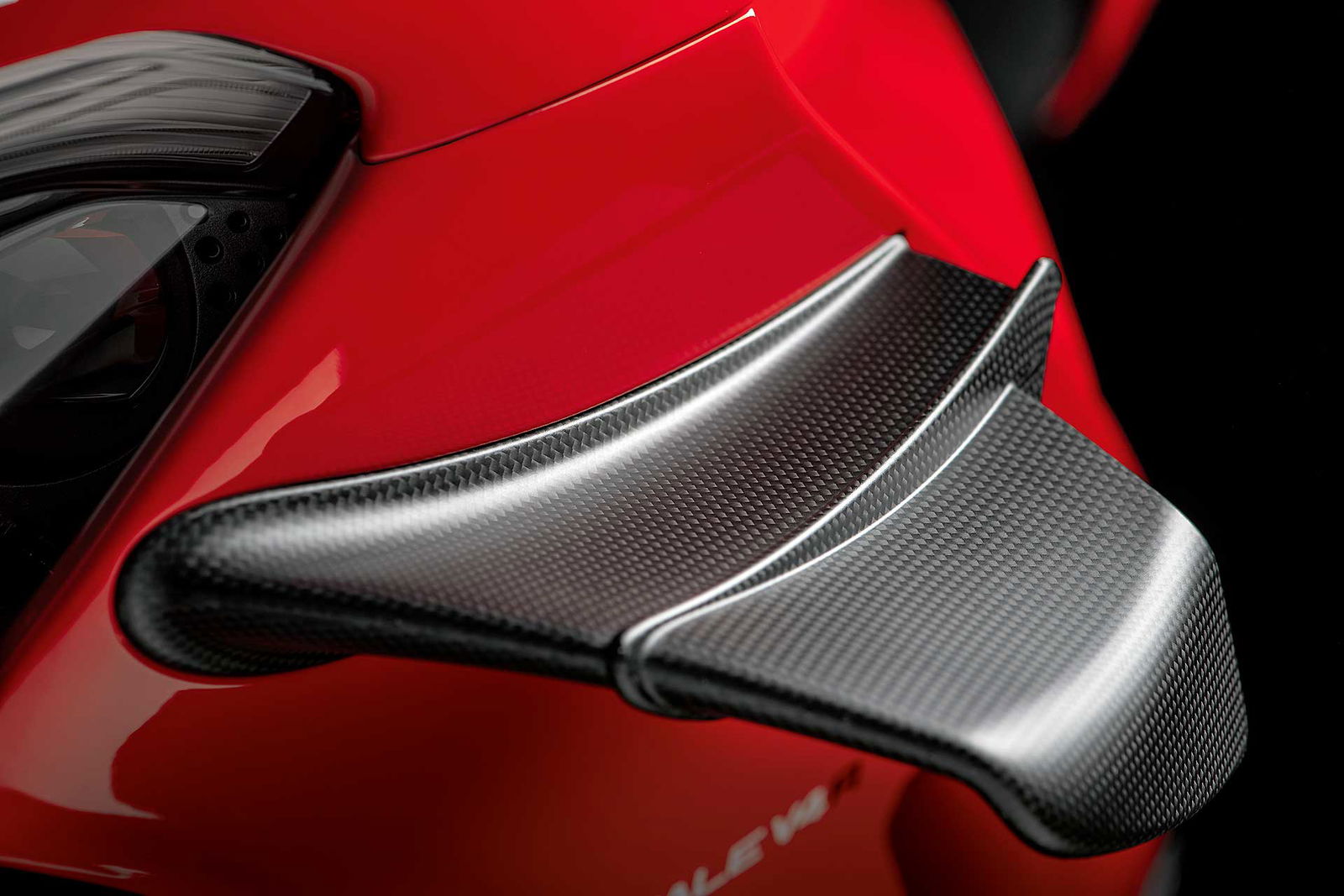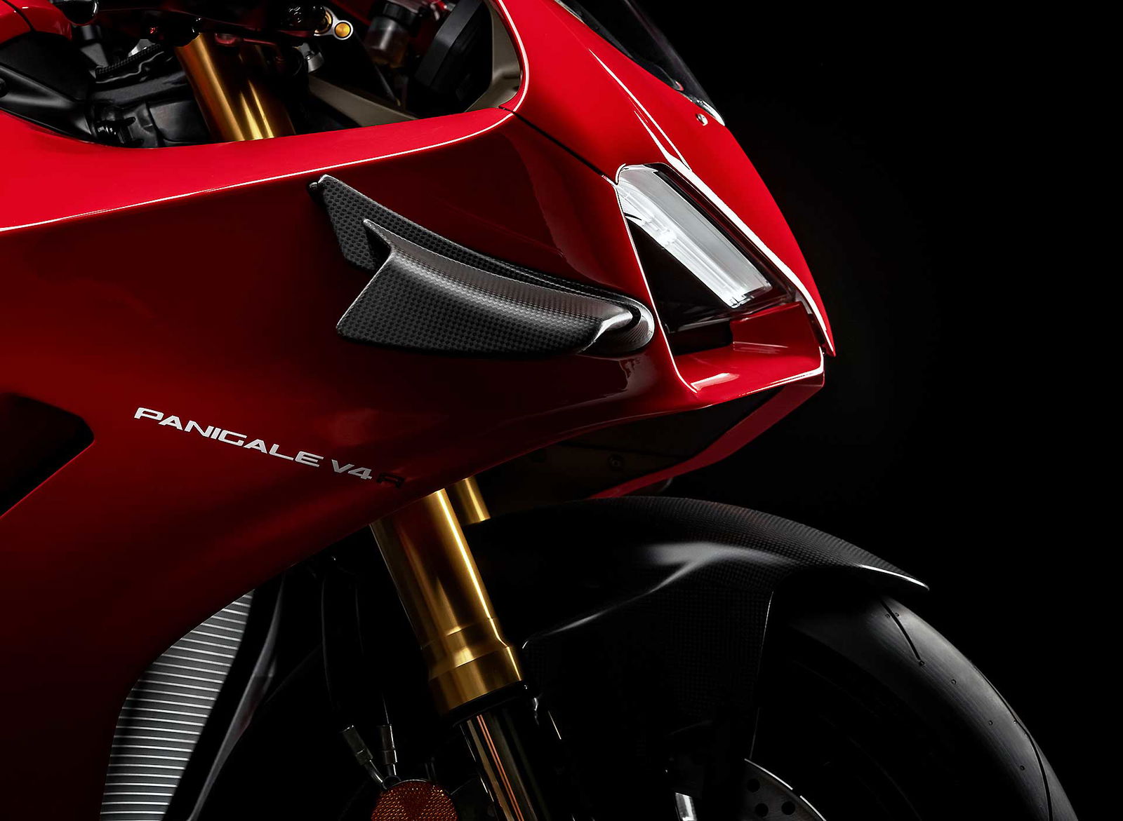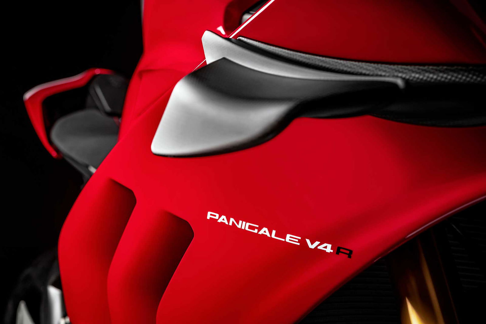 La carenatura della Panigale V4 R segue i criteri di massima funzionalità aerodinamica, come accade in MotoGP. Il reparto corse ha messo mano pesantemente alle sovrastrutture della nuova Superbike di Borgo Panigale, studiando quella che i tecnici Ducati definiscono “carena Aero”, caratterizzata oltre che dalle ali da un cupolino (e relativo plexiglas) più ampio (15 mm per lato) e da carenature di maggiori dimensioni (+38 mm per lato), oltre a estrattori d’aria più efficaci. Le ali aerodinamiche sono parte di questo insieme, che contribuisce ad aumentare il carico sulla ruota anteriore di 30 kg(!) a 270 km/h, evitando “galleggiamenti” e limitando le impennate.