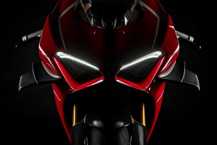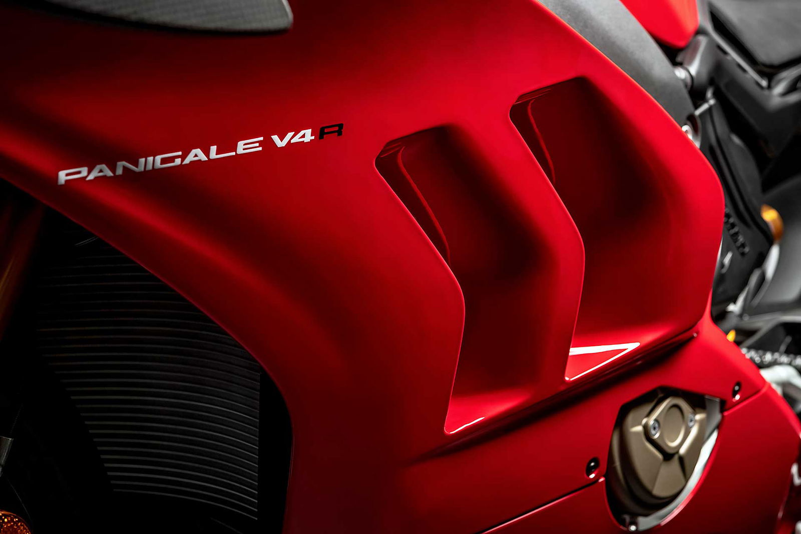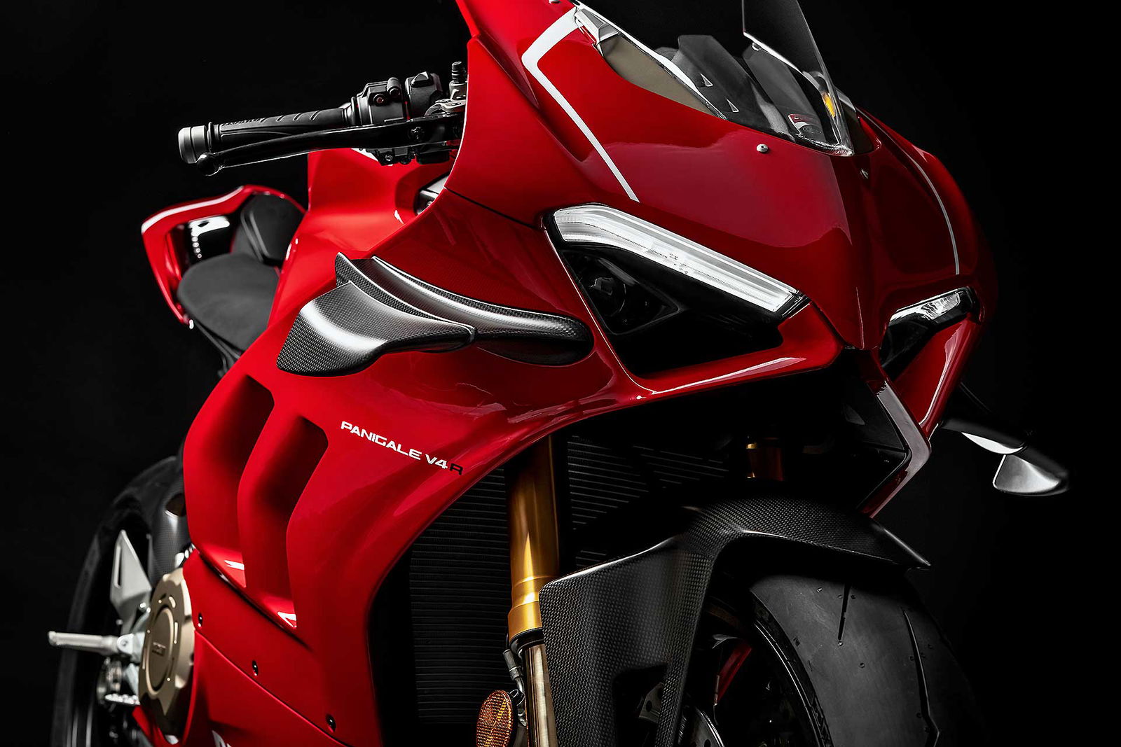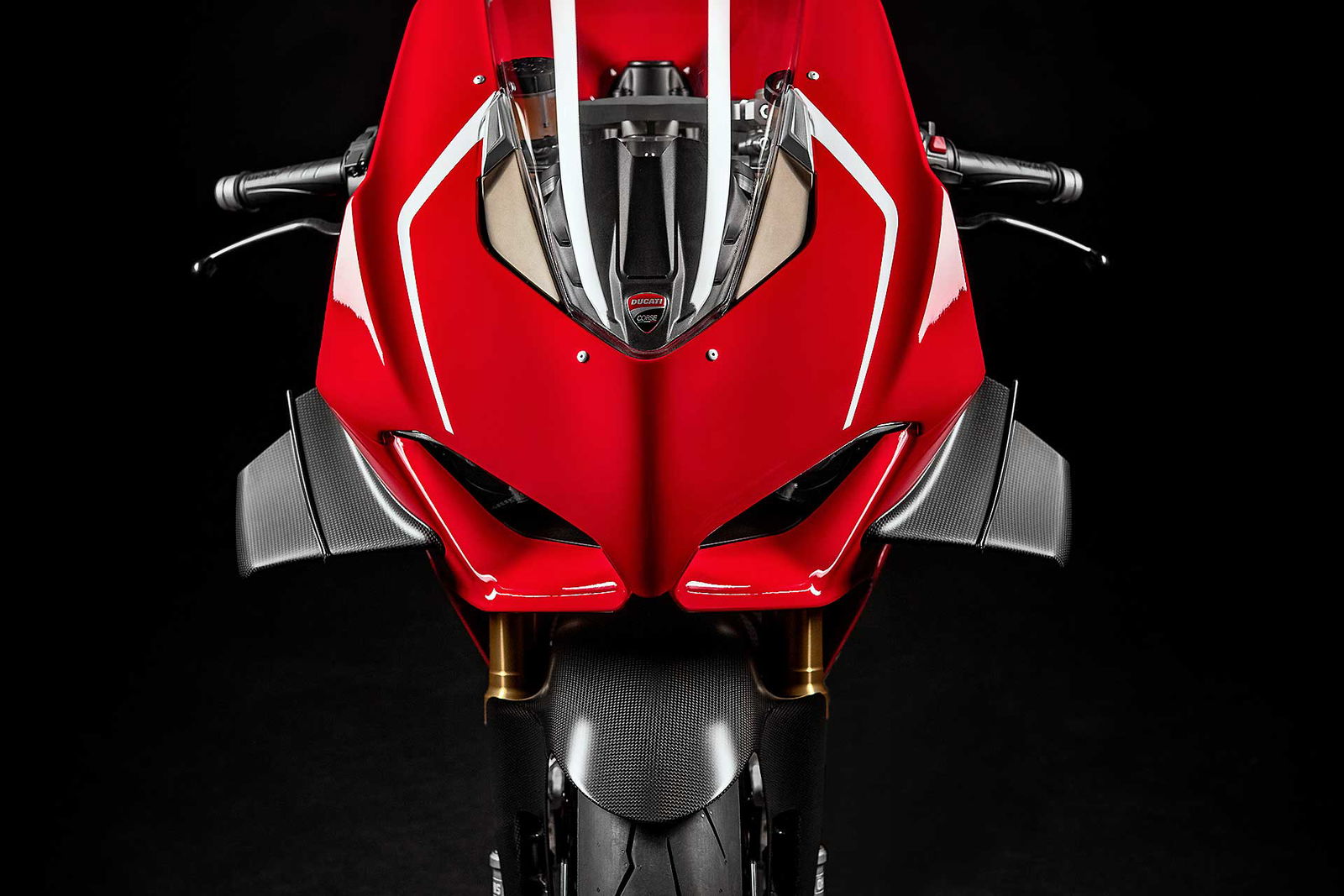 La carenatura della Panigale V4 R segue i criteri di massima funzionalità aerodinamica, come accade in MotoGP. Il reparto corse ha messo mano pesantemente alle sovrastrutture della nuova Superbike di Borgo Panigale, studiando quella che i tecnici Ducati definiscono “carena Aero”, caratterizzata oltre che dalle ali da un cupolino (e relativo plexiglas) più ampio (15 mm per lato) e da carenature di maggiori dimensioni (+38 mm per lato), oltre a estrattori d’aria più efficaci. Le ali aerodinamiche sono parte di questo insieme, che contribuisce ad aumentare il carico sulla ruota anteriore di 30 kg(!) a 270 km/h, evitando “galleggiamenti” e limitando le impennate.