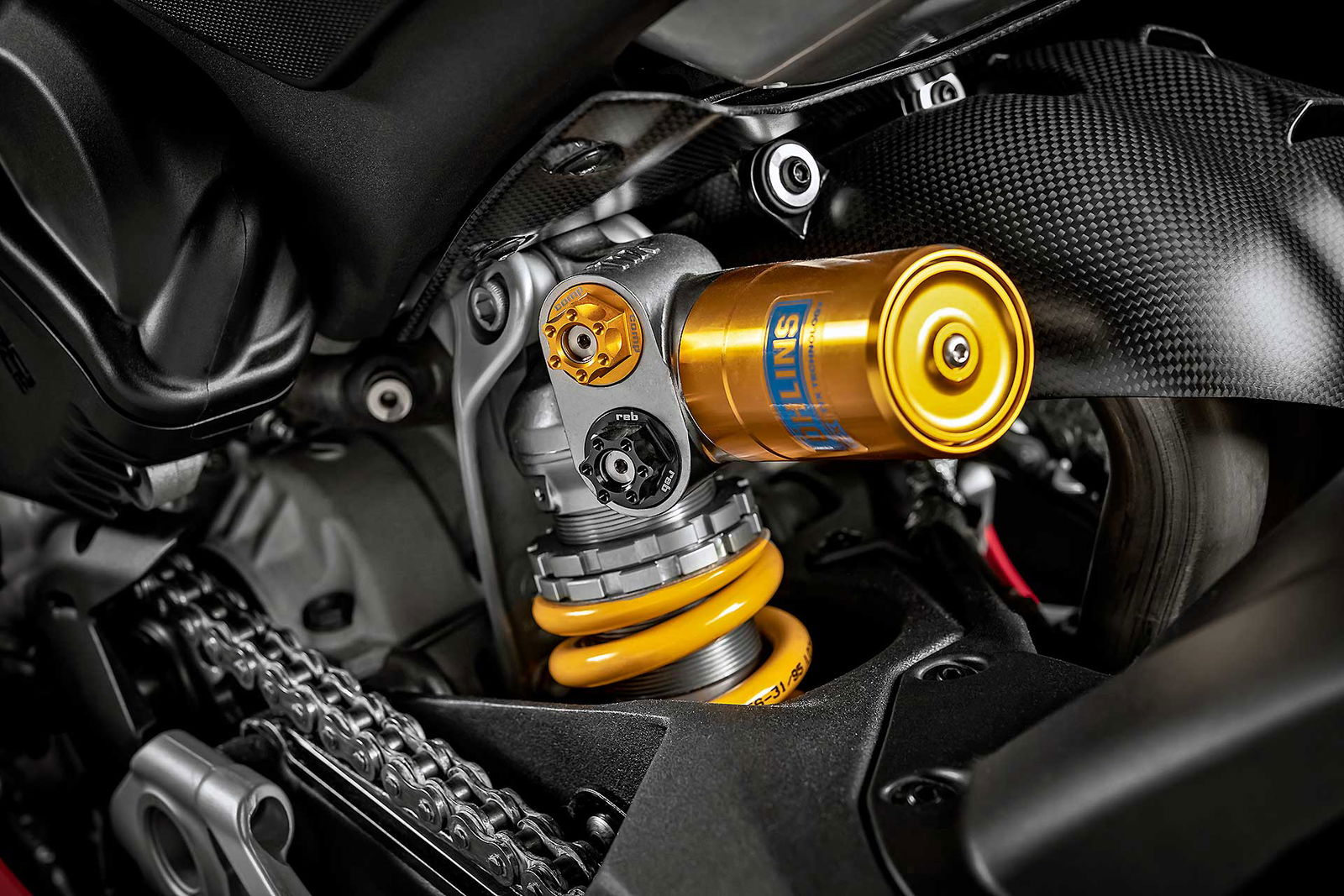Anche la ciclistica è inedita. Se il layout è rimasto invariato con il telaio “front frame” e il motore portante, il telaio ora verniciato nero è stato modificato e alleggerito, il pivot del monobraccio è regolabile su 4 posizioni a step di 2 mm; le sospensioni sono ovviamente meccaniche, con la forcella pressurizzata Ohlins NPX 25-30 e l’onnipresente ammortizzatore TTX36.
