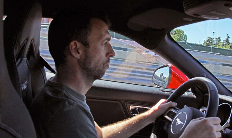 Poco trasferimento di carico in accelerazione e soprattutto in frenata. Il peso è ben distribuito e in ingresso di curva non grava eccessivamente sull’avantreno, che tuttavia mantiene direzionalità e precisione di guida. Lo sterzo risponde preciso ma pretende una presa decisa delle mani. Anche il rollio è ridotto nei cambi di direzione: freni, imposti e acceleri; l’assestamento delle sospensioni è quasi immediato. La spinta laterale dovuta alla velocità non modifica le altezze, con l’assetto che rimane costante fino al momento in cui si inizia nuovamente a raddrizzare le ruote anteriori e a spingere sull’acceleratore.Non facciamoci tradire dal suo aspetto focoso, perché la Mustang pur avendo un’indole sportiva è tale è fino a un certo punto. Più che una “racer” è una vera GT. E non è una questione di cavalli ma di peso, assetto e vocazione. Eppure inevitabilmente stuzzica di continuo la curiosità dei passanti e soprattutto innesca il desiderio di sfida a chiunque entri nella sua orbita. Detto, fatto. Tra curve in rapida successione e soffio del Turbo che avvolge l’abitacolo, sono stato puntato dall’esemplare peggiore di automobilista: il facinoroso con Porsche Turbo e targa russa… Non accetto la sfida a singolar tenzone perché tengo alla mia patente, ma i tentativi di ingaggio da parte sua sono a dir poco esilaranti, con buona pace delle valvole del boxer tedesco e della girante del Turbo, che per oggi resta a bocca asciutta. Auf Wiedersehen.