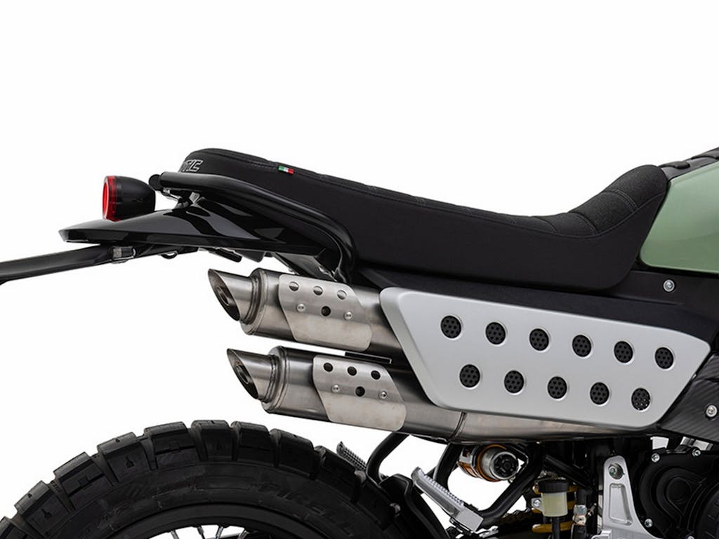 Una cosa che si nota salendo in sella è che il cavalletto fa stare la moto piuttosto inclinata. Detto questo, l’ergonomia da scrambler è buona: le pedane sono un po’ altine, quindi quando ti alzi in piedi per guidare in fuoristrada hai tanta escursione tra la sella e le pedane. Il serbatoio è molto stretto tra le gambe, non dà fastidio neanche nella guida in piedi. Affronto subito il tema della temperatura: l’isolamento dal calore della parte sotto la sella è molto efficiente. Quello che si sente quando si guida la moto nel traffico è il caldo che viene su dal collettore, verso la parte alta della coscia. Sarebbe stato utile, magari, prolungare un pochino la protezione.