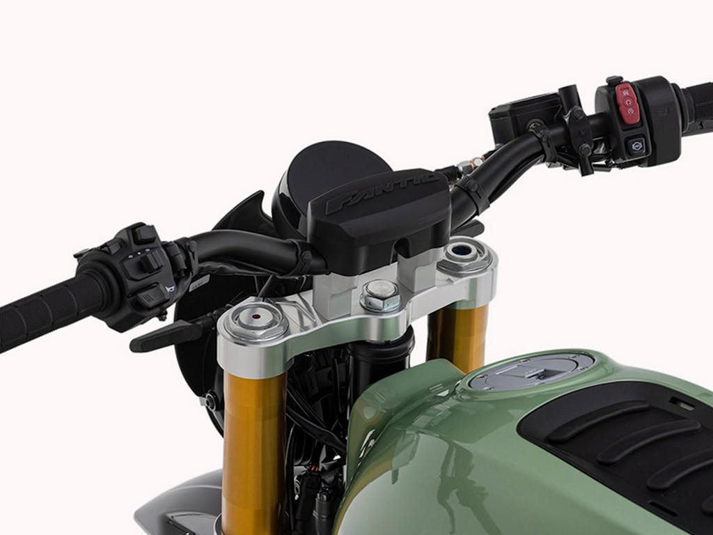 La nuova Scrambler con la ruota da 21 pollici di Fantic ha un impatto visivo interessante. Fantic ha curato molto i dettagli, come le piastre della forcella ricavate dal pieno, che sono sempre un bel vedere. Il paracolpi è offerto di serie e la strumentazione è molto compatta, con uno schermo opaco che non fa riflesso e si legge molto bene anche quando c’è il sole.