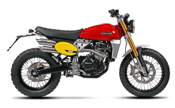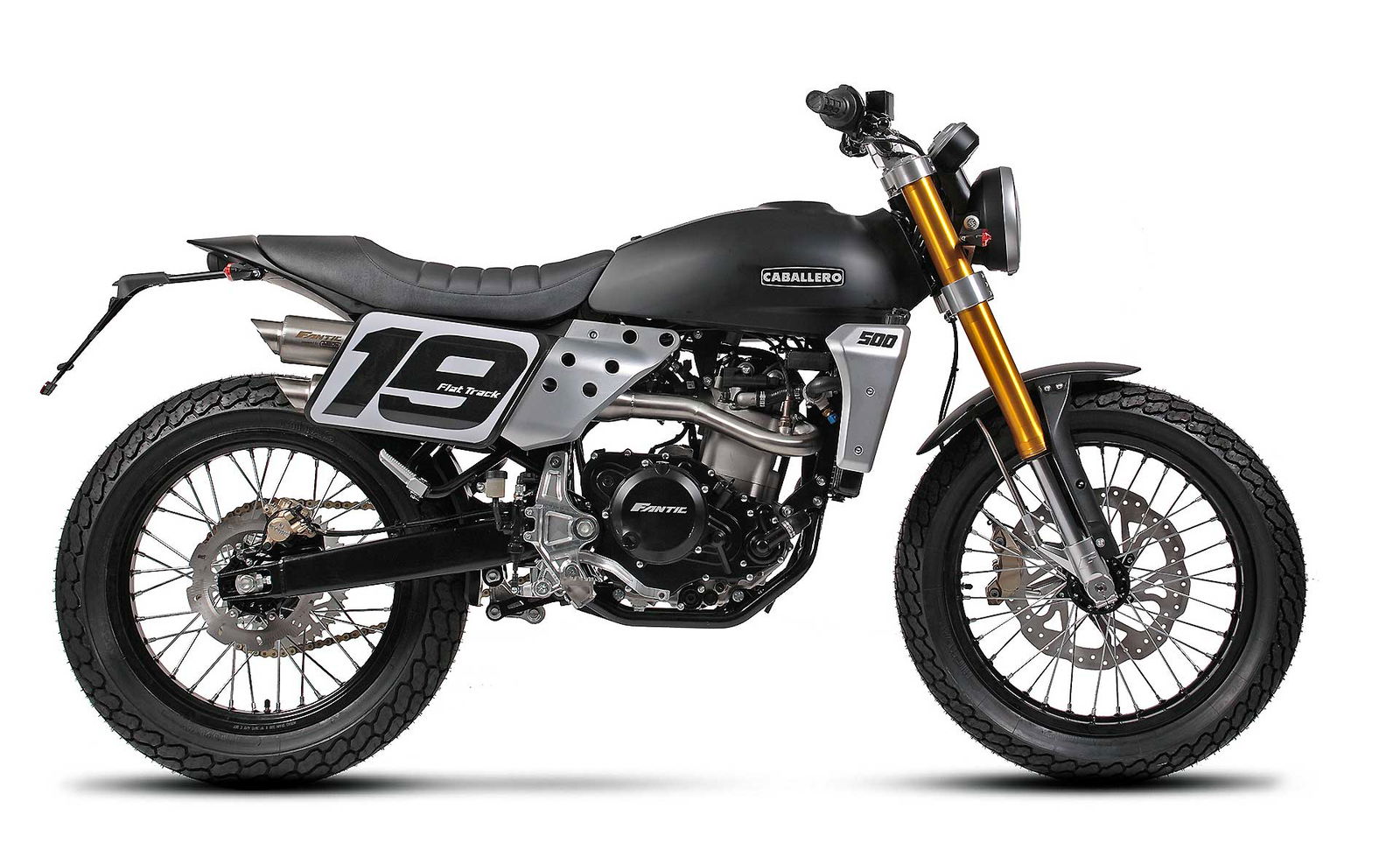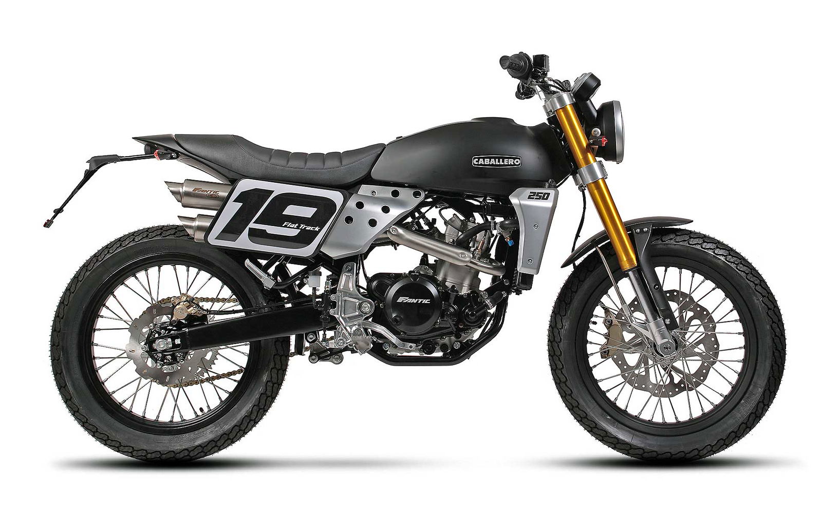Due allestimenti, tre cilindrate, stessa base meccanica. Il Fantic Caballero del 2017 sfrutta per tutti i modelli la medesima struttura del telaio: un monotrave in acciaio con culla inferiore e forcellone (in alluminio per le 500, in acciaio per 125 e 250) infulcrato al monoammortizzatore tramite leveraggi. Identiche le sospensioni: davanti c’è una forcella Fantic FRS con steli da 41 mm non regolabile, dietro un mono Fantic FRS regolabile nel precarico. Identiche su tutti i modelli anche le quote ciclistiche: 1.425 mm l’interasse, 845 mm l’altezza della sella. Non cambia nemmeno il serbatoio da 12 litri e l’impianto frenante con disco anteriore da 320 mm lavorato da pinza radiale e ABS a due canali Continental. Flat Track e Scrambler si differenziano per le misure delle ruote: 110/80-19 e 140/80-17 la Scrambler 500 (125 e 250 Scrambler hanno la gomma posteriore da 130), 130/80-19 e 140/80-19 tutte le versioni Flat Track.