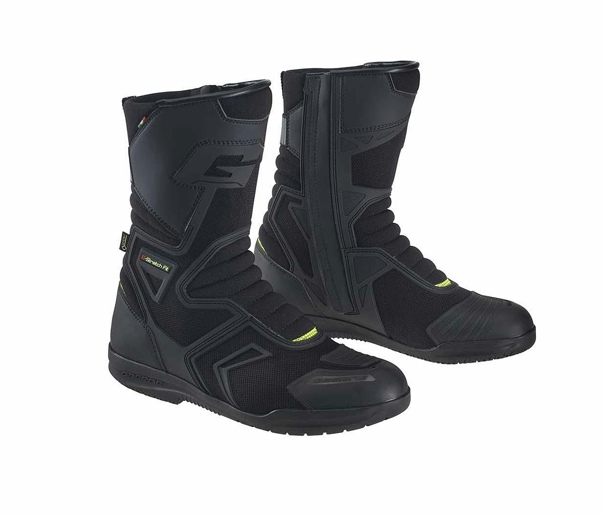 I nuovi stivali Gaerne G.Helum Gore-Tex sono pensati per il turismo in moto, in ogni condizione e con qualunque mezzo. Alla sicurezza di chi li indossa pensano i rinforzi su tibia e malleoli, il para leva (integrato alla tomaia) nella zona frontale e gli inserti fluo. Gli snodi anteriore e posteriore sono elasticizzati.