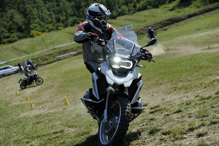 Il casco GS è piuttosto leggero (1450 ± 50 grammi) ma ciò che più si apprezza è la stabilità del visierino. Su molti caschi analoghi infatti, al di sopra di una certa velocità, si avverte una fastidiosissima vibrazione. Non sul visierino casco GS, sempre stabile anche alle alte velocità.E’ quindi la volta del test in fuoristrada, sul campo scuola della GS Academy e poi nei sentieri che si attorcigliano sulle colline nei dintorni della tenuta.Gli esercizi che facciamo al seguito del mitico Beppe Gualini (10 Dakar all’attivo e oggi capo-istruttore qui a Pomino) all’inizio non sono per nulla semplici e c’è davvero da sudare. Con questo caldo la tuta Rally si apprezza soprattutto per l’ottima aerazione, anche alle basse velocità.