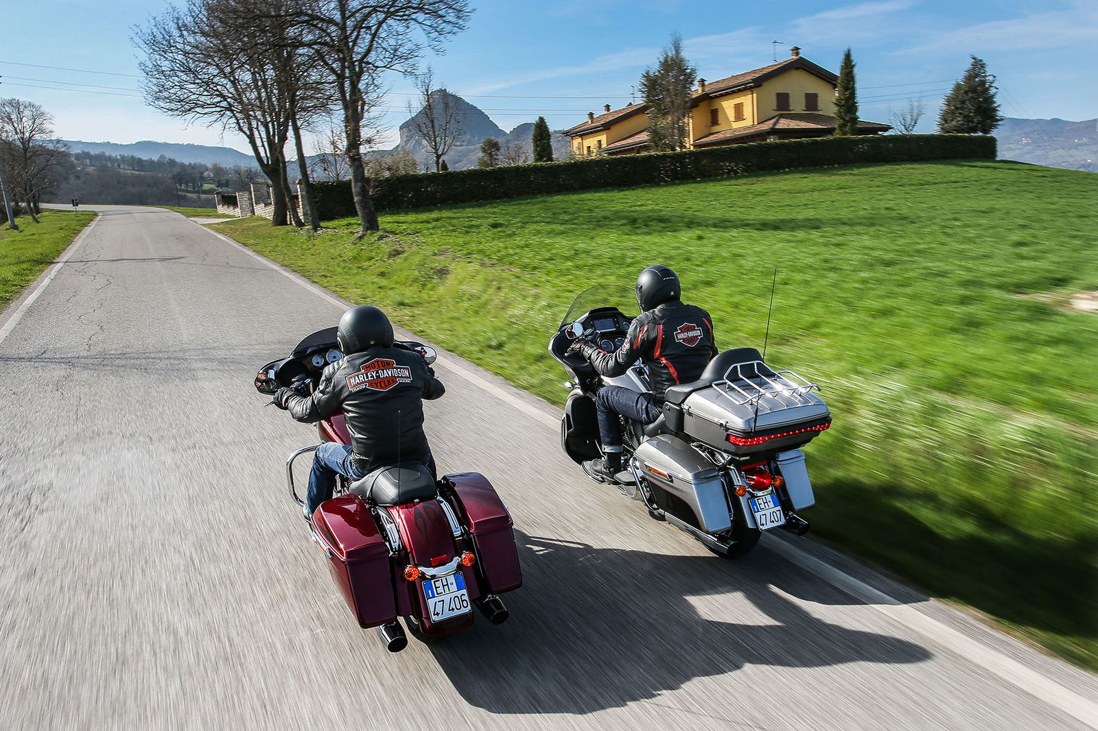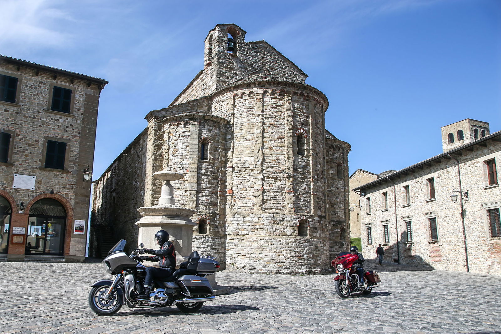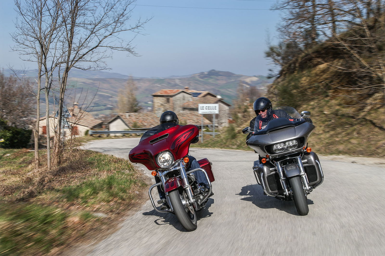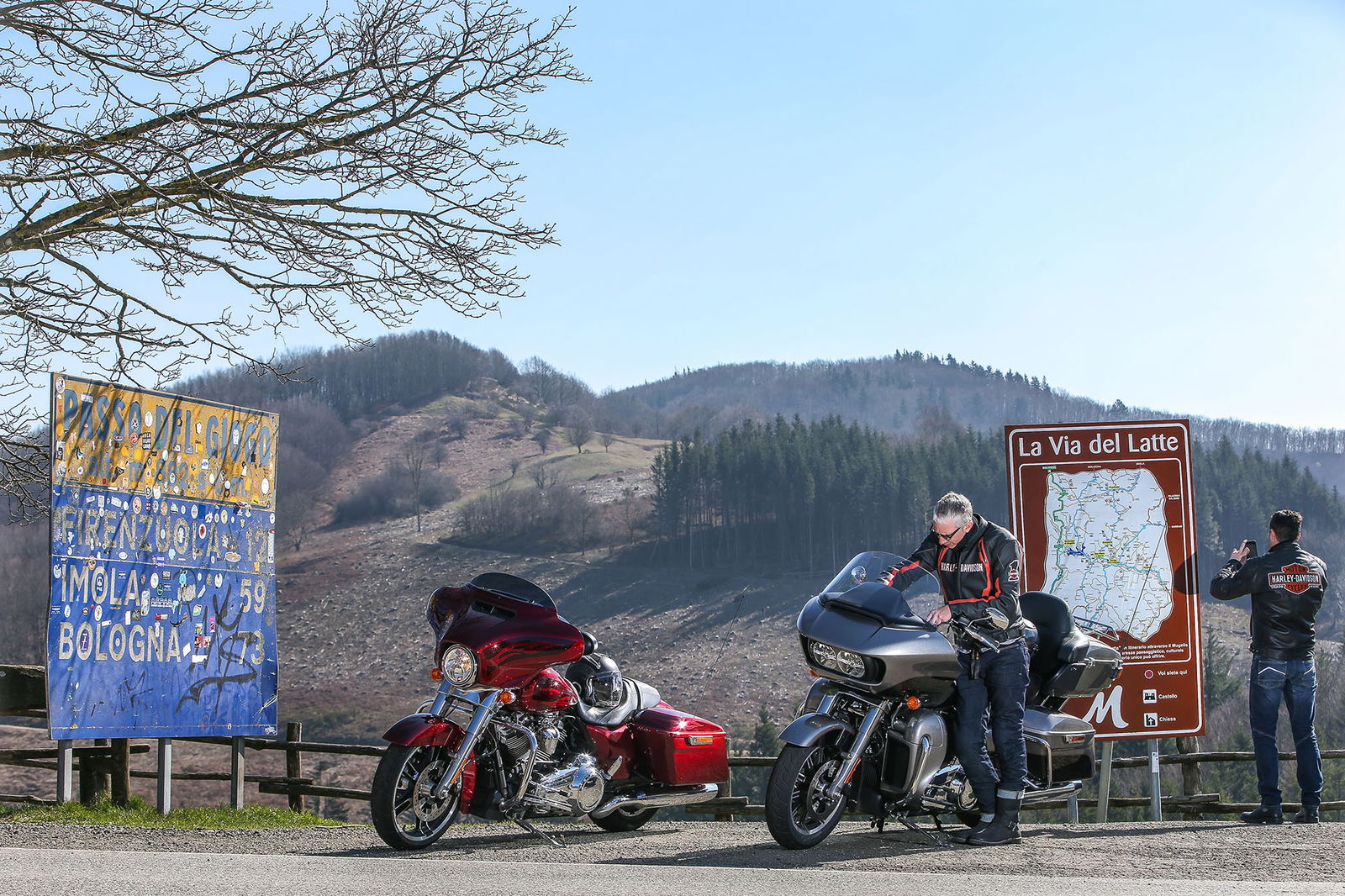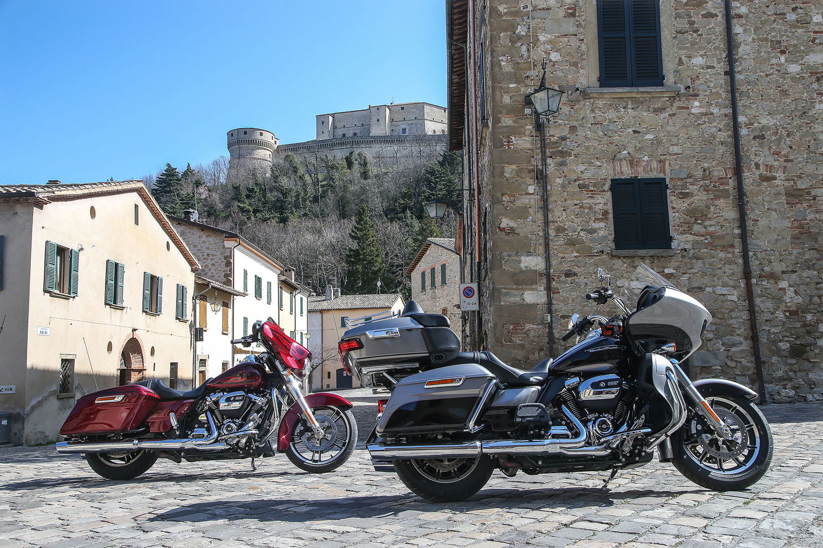 “Quelle foto lì le facevo alla Bellucci”. Così, spuntando dal nulla, si è rivolto a noi uno strano personaggio sulla settantina, capello mosso bianco e lungo, stile Maurizio Vandelli, nell’incantevole borgo di San Leo, mentre lo staff di RED riprendeva le nostre imponenti americane nel bel mezzo della piazza principale. Non siamo nemmeno riusciti a rispondergli. Però è rimasta quella frase ad accompagnarci per tutto il viaggio Est-Ovest in Harley-Davidson da Rimini a Lido di Camaiore, lungo la Linea Gotica. https://youtu.be/mO2-u1QtB2sDi cosa si tratta? Del confine simbolico che al termine della Seconda Guerra mondiale si estendeva dalla provincia di Apuania (che coincide con l’attuale provincia di Massa e Carrara) fino alla costa adriatica di Pesaro, seguendo un fronte di oltre 300 chilometri sui rilievi delle Alpi Apuane, proseguendo verso Est lungo le colline della Garfagnana, sui monti dell’Appennino modenese, quello bolognese, pistoiese, l’Alta Valle dell’Arno, quella del Tevere e l’Appennino forlivese, per poi terminare sul versante adriatico negli approntamenti difensivi tra Rimini e Pesaro. Noi, in realtà, l’abbiamo ripercorsa in senso opposto, non solo per fare memoria di quei mesi tragici ed eroici ma alla ricerca di belle strade.A nostra disposizione ci sono due gioielli americani targati Milwaukee. Una è la Street Glide Special (prezzo a partire da 27.000 euro), bella da perderci la testa e arrogante come non mai in questa edizione con livrea “infiammata” su base rossa intensissima. L’altra è la Road Glide Ultra da 29.000 euro, comoda come poche altre, sobria nella grafica e un po’ meno nell’aspetto, che è a dir poco imponente. Insomma, nessuna delle due passa inosservata. E va bene così.