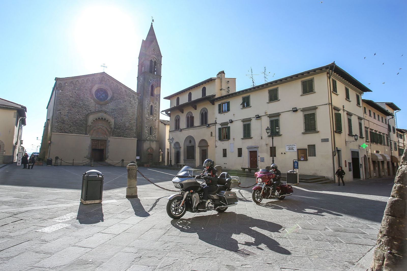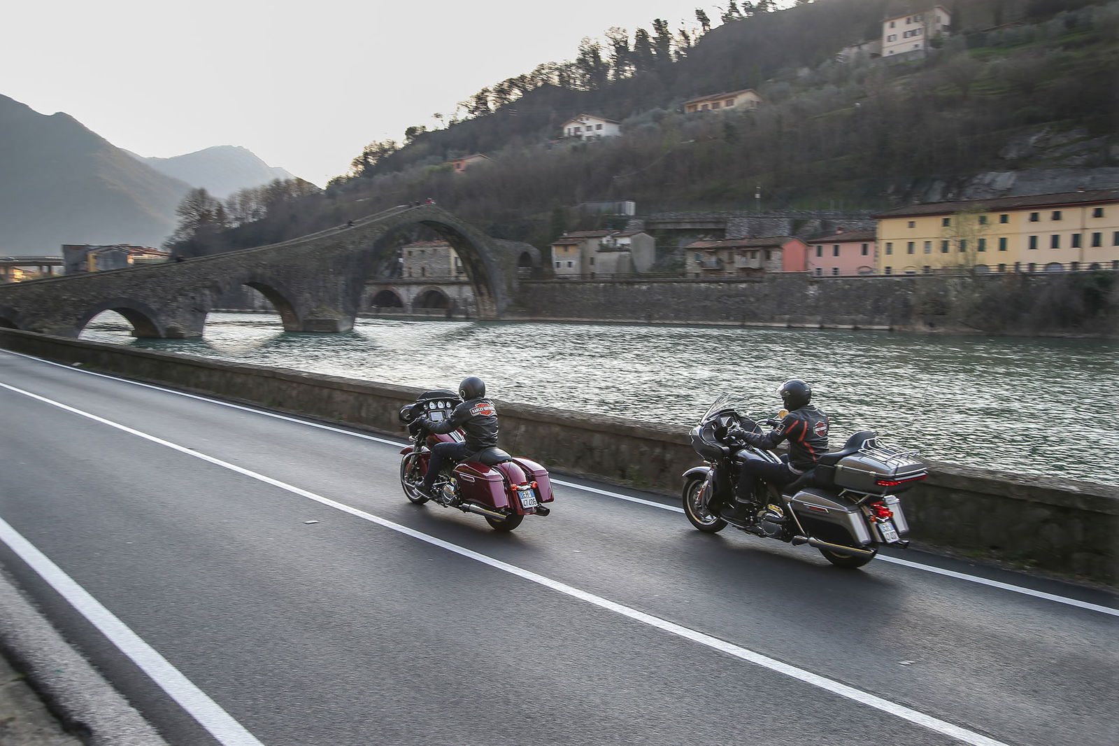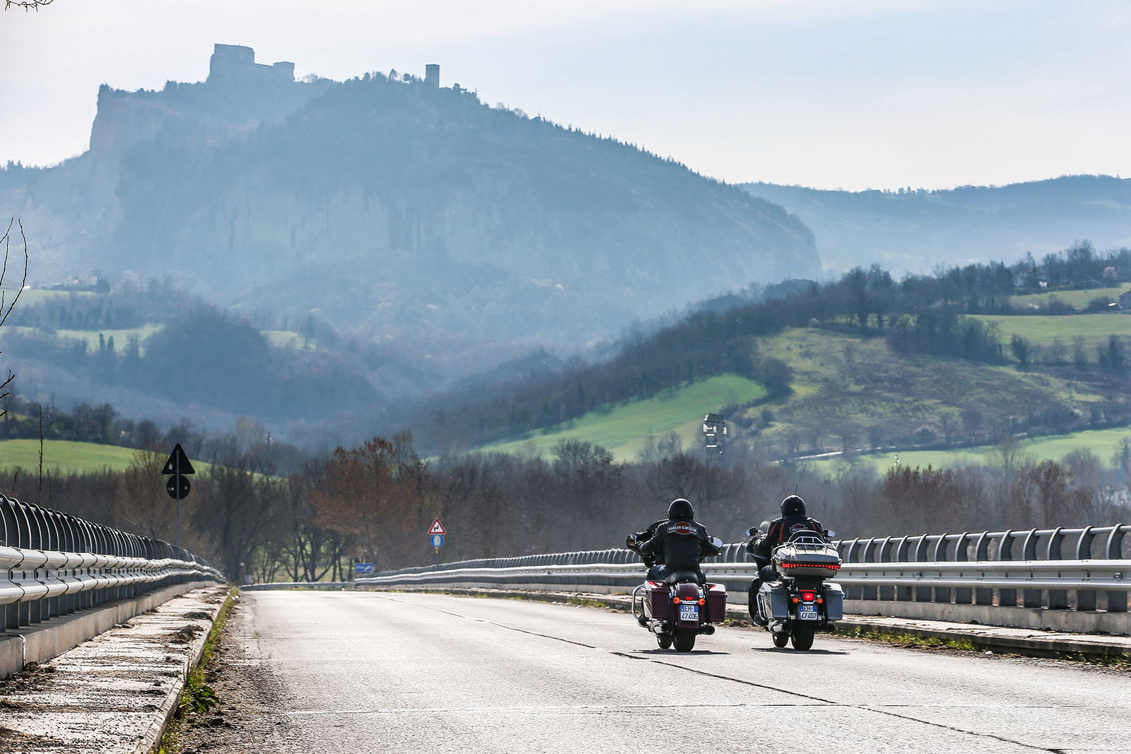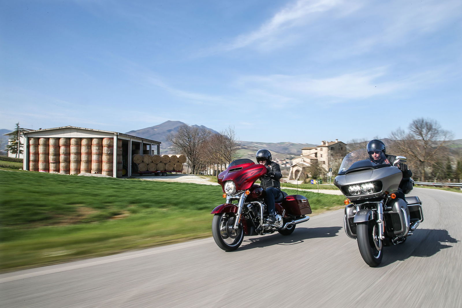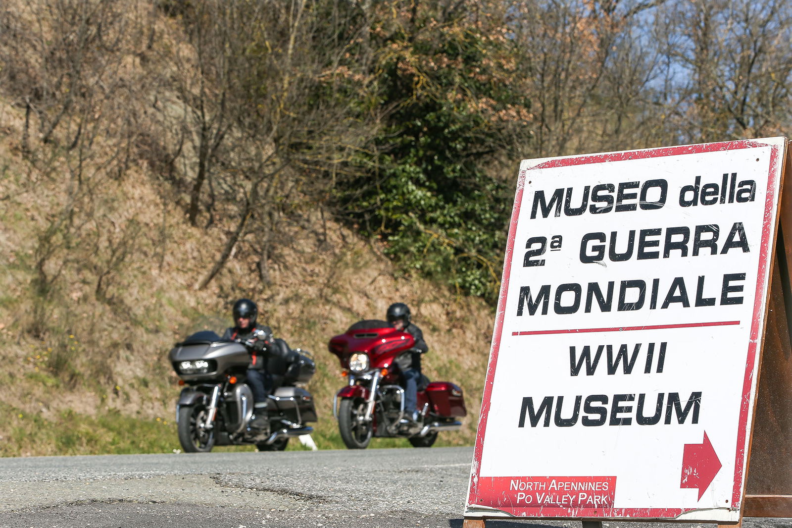“Quelle foto lì le facevo alla Bellucci”. Così, spuntando dal nulla, si è rivolto a noi uno strano personaggio sulla settantina, capello mosso bianco e lungo, stile Maurizio Vandelli, nell’incantevole borgo di San Leo, mentre lo staff di RED riprendeva le nostre imponenti americane nel bel mezzo della piazza principale. Non siamo nemmeno riusciti a rispondergli. Però è rimasta quella frase ad accompagnarci per tutto il viaggio Est-Ovest in Harley-Davidson da Rimini a Lido di Camaiore, lungo la Linea Gotica. https://youtu.be/mO2-u1QtB2sDi cosa si tratta? Del confine simbolico che al termine della Seconda Guerra mondiale si estendeva dalla provincia di Apuania (che coincide con l’attuale provincia di Massa e Carrara) fino alla costa adriatica di Pesaro, seguendo un fronte di oltre 300 chilometri sui rilievi delle Alpi Apuane, proseguendo verso Est lungo le colline della Garfagnana, sui monti dell’Appennino modenese, quello bolognese, pistoiese, l’Alta Valle dell’Arno, quella del Tevere e l’Appennino forlivese, per poi terminare sul versante adriatico negli approntamenti difensivi tra Rimini e Pesaro. Noi, in realtà, l’abbiamo ripercorsa in senso opposto, non solo per fare memoria di quei mesi tragici ed eroici ma alla ricerca di belle strade.A nostra disposizione ci sono due gioielli americani targati Milwaukee. Una è la Street Glide Special (prezzo a partire da 27.000 euro), bella da perderci la testa e arrogante come non mai in questa edizione con livrea “infiammata” su base rossa intensissima. L’altra è la Road Glide Ultra da 29.000 euro, comoda come poche altre, sobria nella grafica e un po’ meno nell’aspetto, che è a dir poco imponente. Insomma, nessuna delle due passa inosservata. E va bene così.