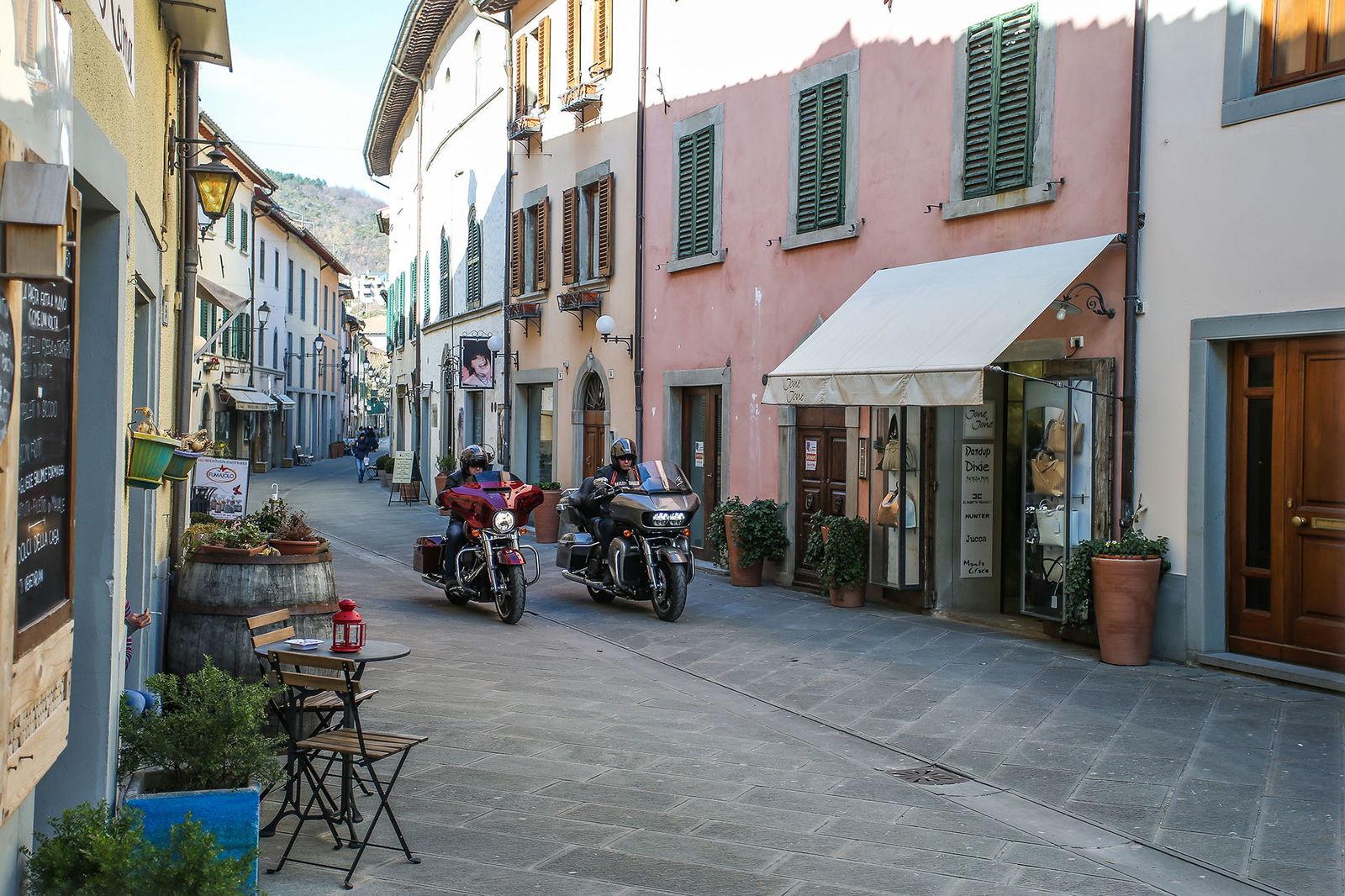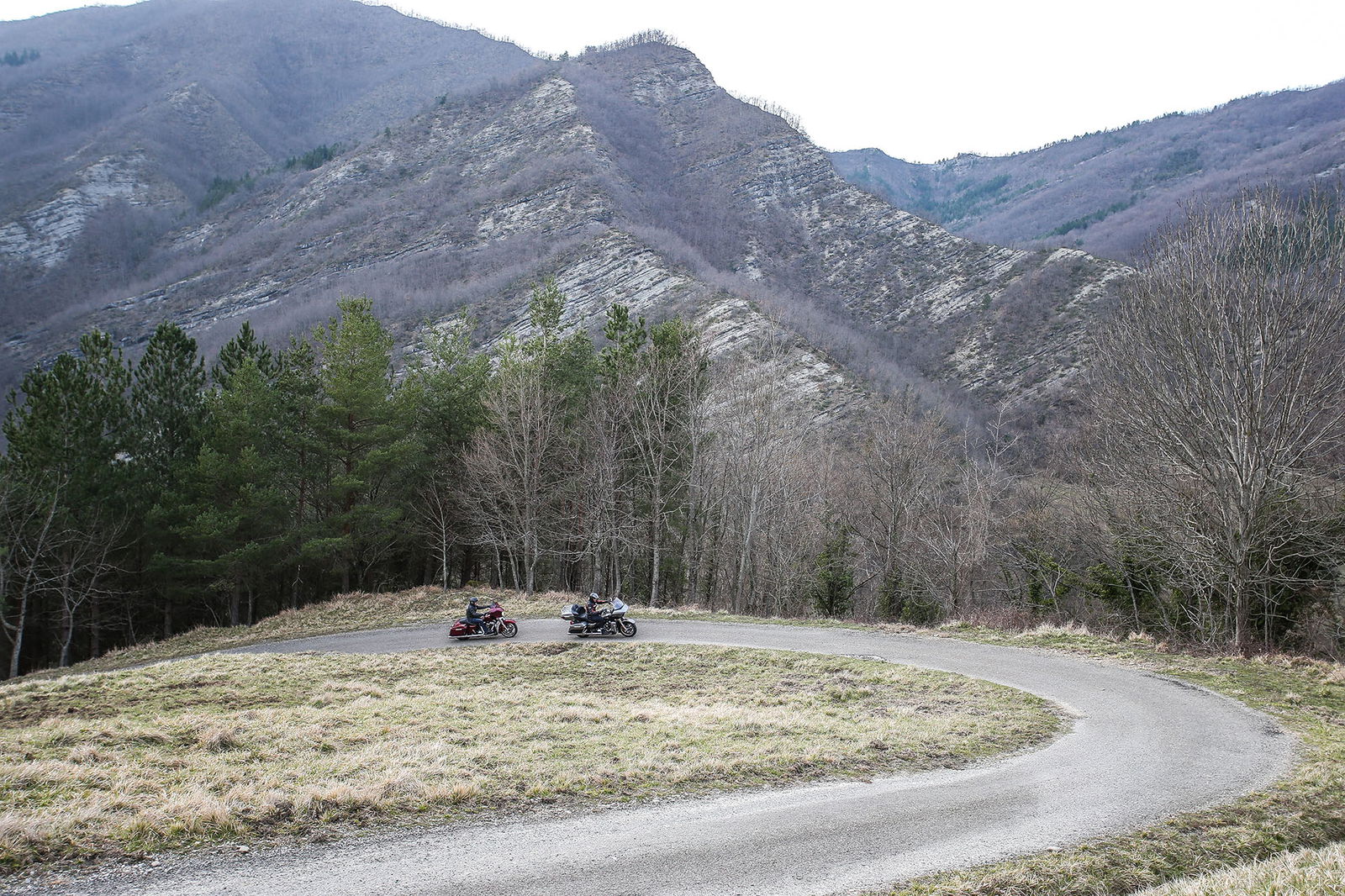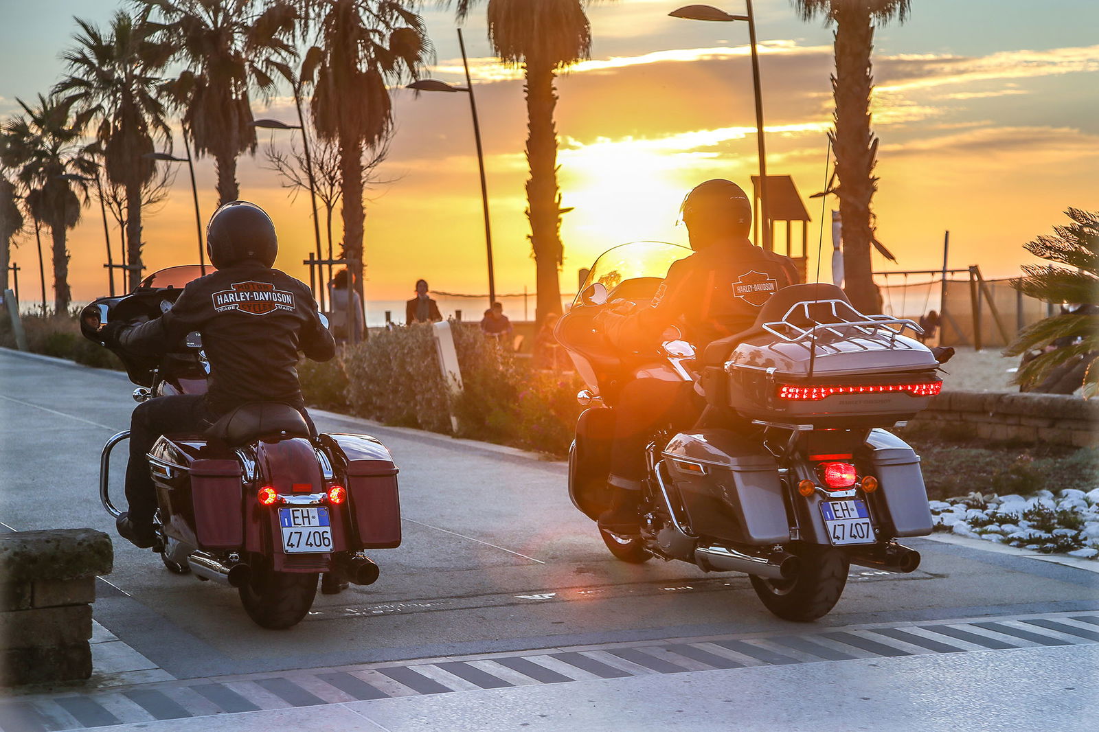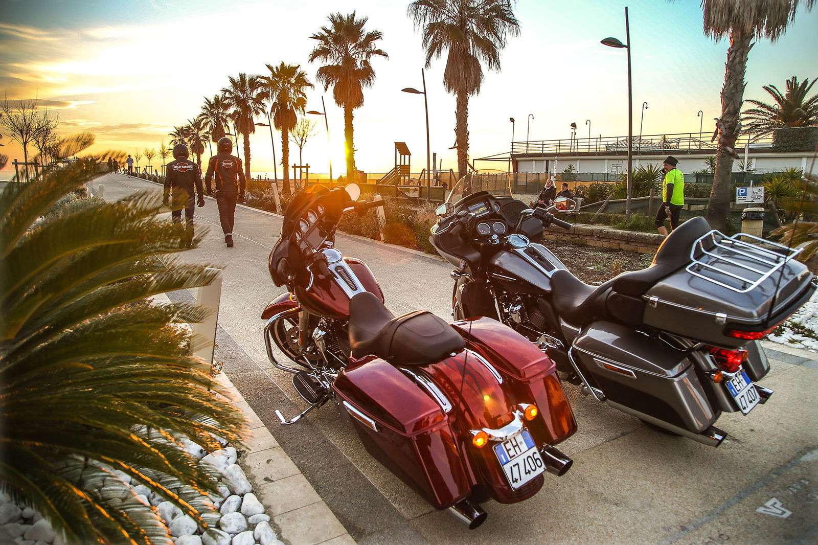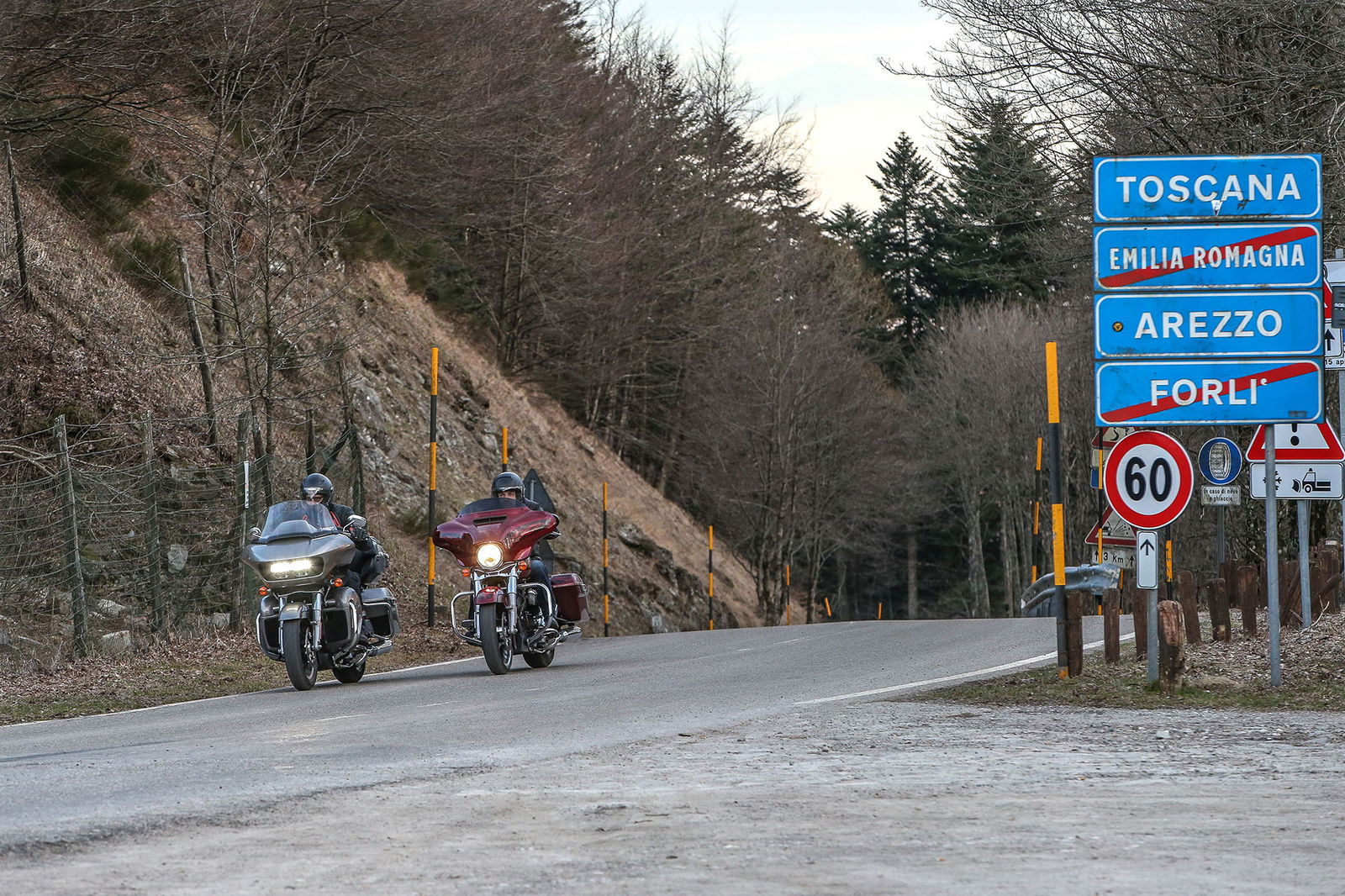 Ma torniamo a monte, anzi, a mare, perché proprio di fronte all’Adriatico ci siamo mossi con il Tirreno nel mirino. Partenza all’alba dal lungomare di Rimini, molo di Viserba. Alla guida delle americane il sottoscritto e Daniel D’Amico, collaboratore di RED ed ex pilota di velocità, che da anni usa la moto solo in pista come istruttore di guida sportiva veloce alla Riding School Pedersoli di Brescia Franciacorta. A lui è stata destinata l’Harley-Davidson Street Glide, che rispetto alla Road Glide Ultra (ben 425 chili pronta all’uso) è più leggera e compatta, nonostante pesi 376 chili in ordine di marcia. Su due ruote non sono uno scherzo ma con qualche malizia e un po’ di pratica diventano gestibili. Non è questione di forza o di corporatura, perché i piani sella sono posti rispettivamente a 685 e 735 mm, perciò alla portata di tutti.