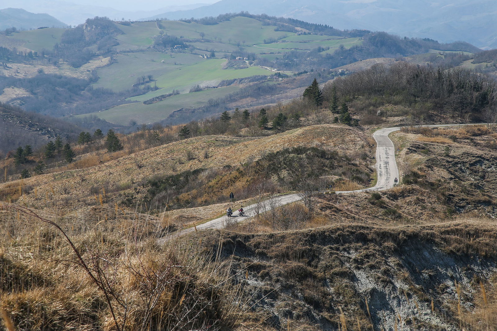 La prima tappa è dopo soli 30 chilometri, ed è la più suggestiva dell’intero itinerario: San Leo, nella Valmarecchia, ancora in provincia di Rimini, meno di tremila persone che vivono in un borgo che lascia senza fiato per la sua bellezza. Facciamo una sosta alla Taverna delle Guardie che ci accoglie con un sorriso e un buon caffè. C’è anche un piccolo parcheggio gratuito per le moto. La destinazione successiva è Bagno di Romagna. Nel frattempo abbiamo percorso decine di chilometri in collina, zeppi di curve e con strade quasi sempre belle anche se dal fondo talvolta dissestato. Per arrivarci imbocchiamo un tratto della E45, nota per le condizioni dell’asfalto non certo impeccabili: la percorriamo volentieri perché dopo la “sbronza” di curve è rilassante andare in rettilineo, attività perfetta per queste Harley-Davidson, di cui sfruttiamo il cruise control e apprezziamo il comfort.