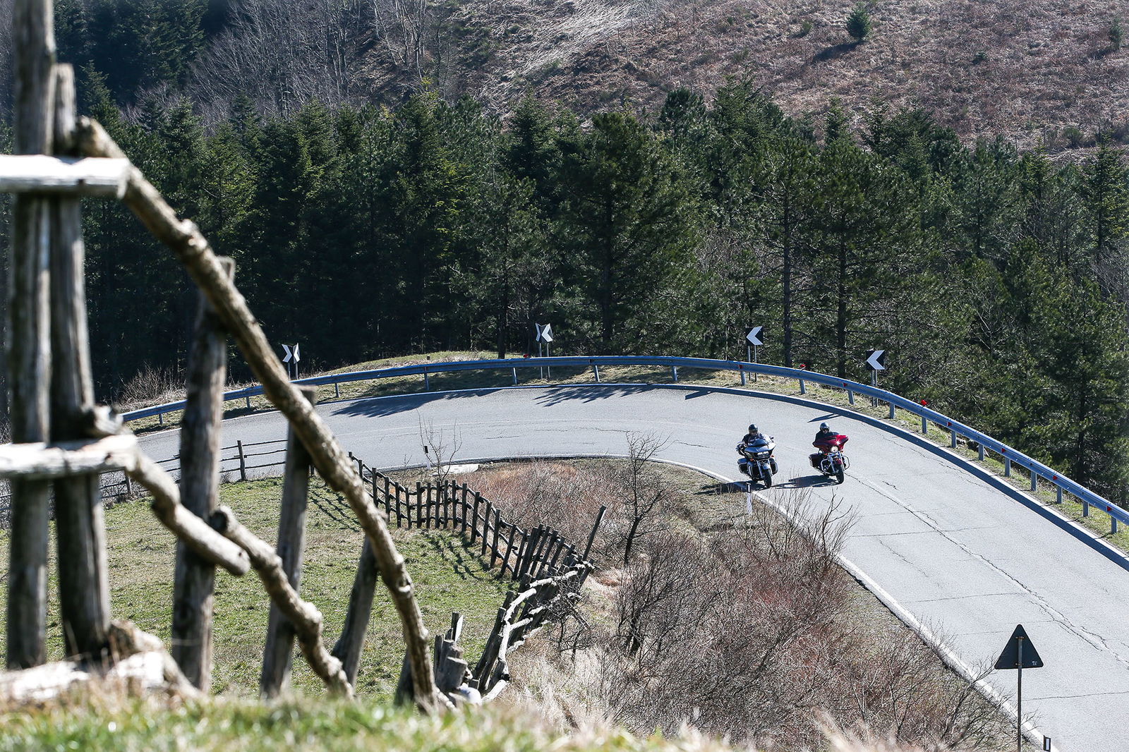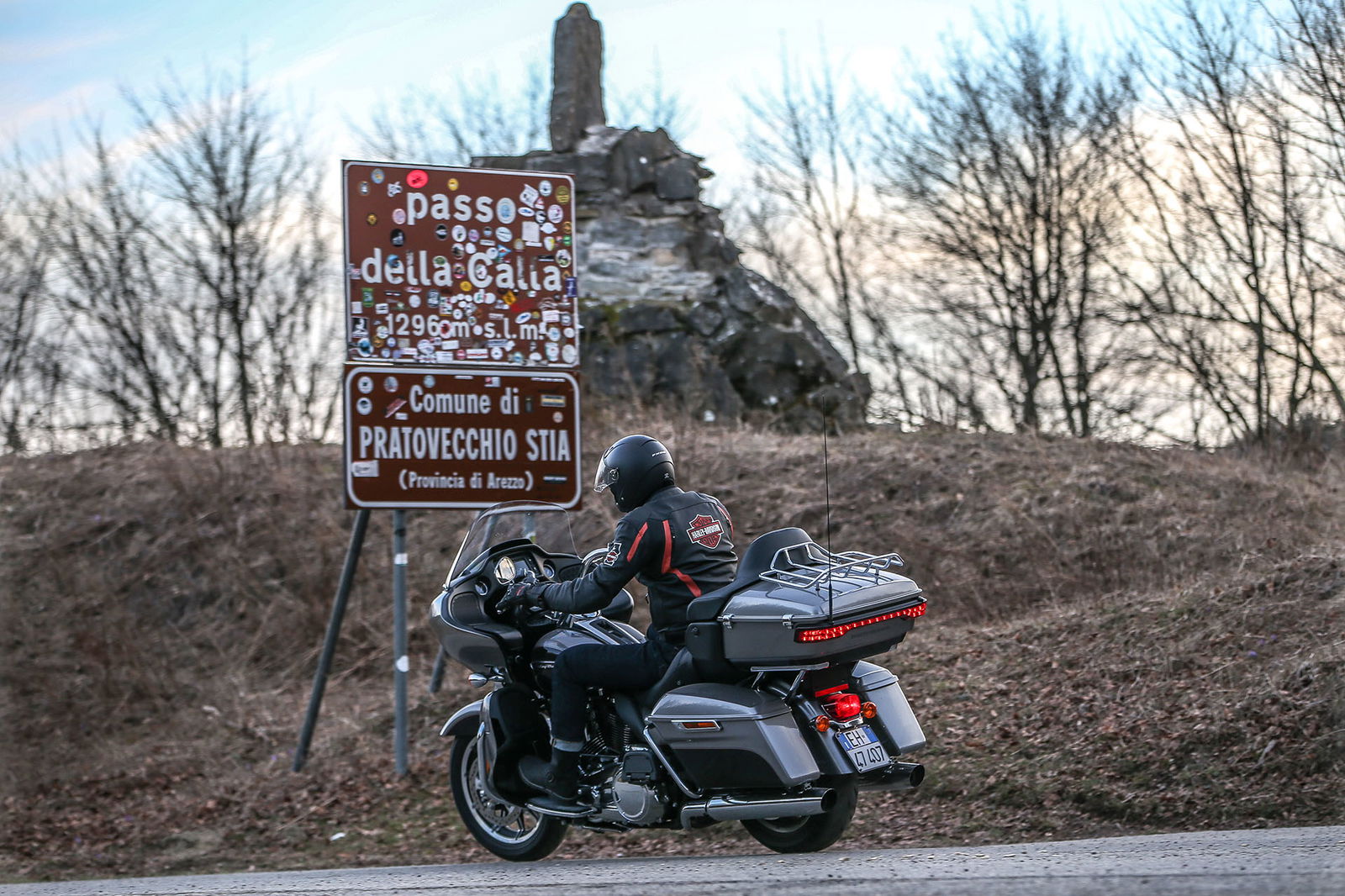 Le due Harley-Davidson in prova dispongono di navigatore satellitare e impianto di intrattenimento in grado di “conversare” con lo smartphone, che nel frattempo si ricarica e fornisce, volendo, tutto il meglio della personale hit musicale, oltre a permettere conversazioni telefoniche in vivavoce o con auricolare Bluetooth. Fare moto turismo con il sottofondo musicale ha tutto un altro sapore, quello di un viaggio parallelo con una storia da raccontare.Bagno di Romagna è una bella cittadina nota anche per le sue terme. Occhio a selezionare bene il ristorante e non farsi abbagliare da menù troppo ricercati: puntate al concreto con i piatti tipici, non si sbaglia mai. Da qui l’obiettivo successivo è la diga di Ridracoli: per raggiungerla le strade sono in alcuni tratti al limite dell’off road e piuttosto strette, facciamo quasi un motorally e impolveriamo a malincuore le due Harley-Davidson. Peccato scoprire che la diga non sia visitabile: è aperta solo in alcuni periodi dell’anno, conviene perciò informarsi prima. Merita comunque una visita, insieme al Rifugio Ca’ di Sopra e all’Idromuseo delle Acque di Ridracoli, in località Santa Sofia (FC). Valichiamo il Passo della Calla attraverso il comune di Pratovecchio Stia, in provincia di Arezzo, con tanti paesaggi degni di nota.