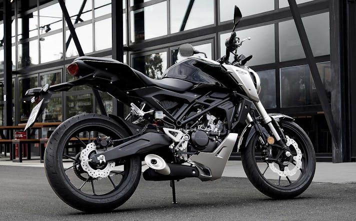 La ciclistica della Honda CB125R sfrutta un telaio a traliccio in tubi di acciaio con piastre di rinforzo. Ha quote molte compatte: solo 1.345 mm d’interasse, cannotto di sterzo inclinato di 24,2°. Le sospensioni non sono banali: davanti c’è una forcella a steli rovesciati da 41 mm, dietro un monoammortizzatore regolabile nel precarico su 5 posizioni. La sella è a 816 mm da terra, mentre alla frenata ci pensa un disco anteriore da 296 mm lavorato da una pinza radiale a 4 pistoncini. Le ruote: entrambe da 17”, montano gomme piuttosto sportive, in misura 110/70 davanti e 150/60 dietro. L’ABS è molto evoluto per questa categoria: è a due canali e, grazie a una piattaforma inerziale IMU, è capace di distribuire al meglio la frenata tra avantreno e retrotreno. La strumentazione è LCD, l’impianto luci full LED (comprese le frecce).