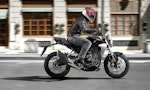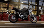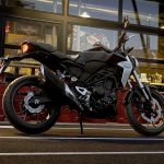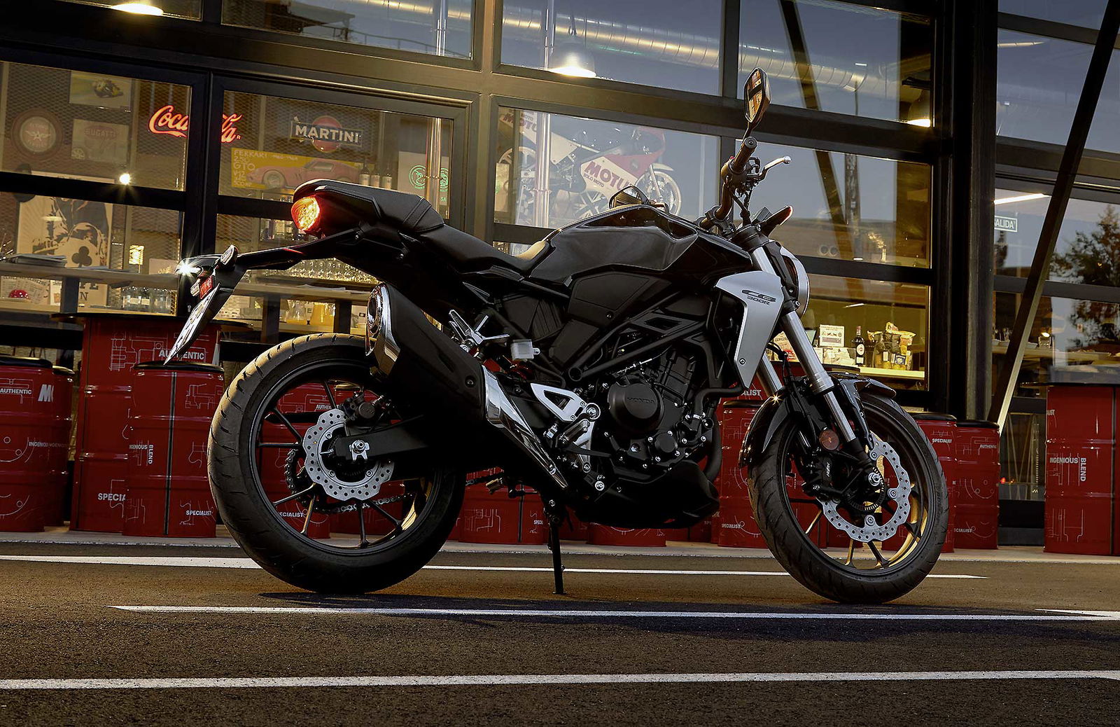 Il piccolo monocilindrico è incastonato in un traliccio d’acciaio con piastre di rinforzo, progettato ex novo per la Honda CB300R. Come per la 125, le quote sono molto compatte: 1.352 mm d’interasse e cannotto di sterzo inclinato di 24°. La sella è a soli 799 mm da terra (addirittura più bassa di quella della 125), le sospensioni sono identiche alla piccola (forcella UD da 41 mm, mono regolabile nel precarico) come anche l’ABS a due canali con piattaforma inerziale IMU (distribuisce la frenata tra anteriore e posteriore), l’impianto luci full LED e la strumentazione LCD a colori.