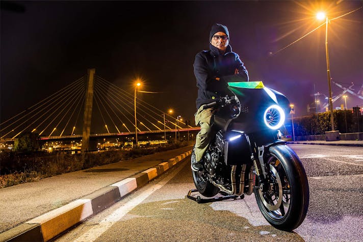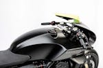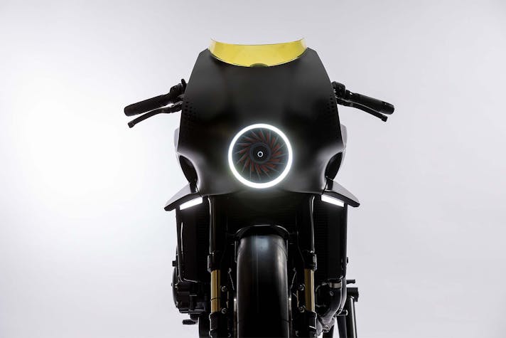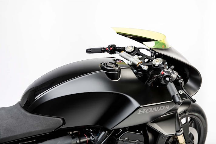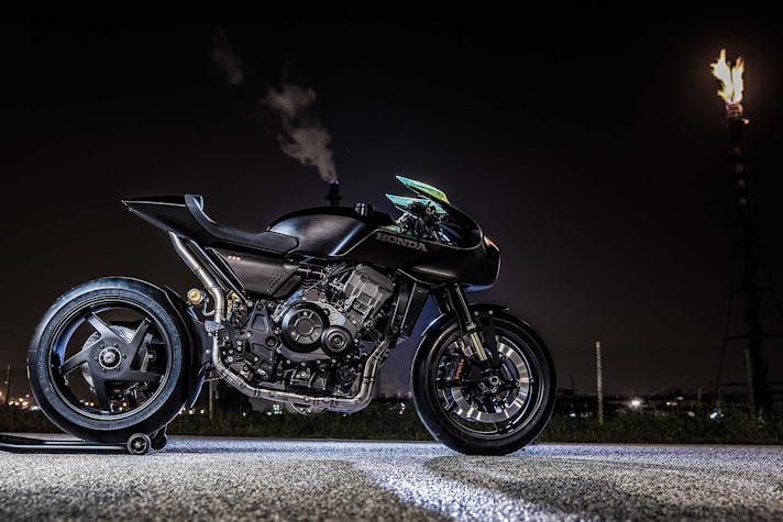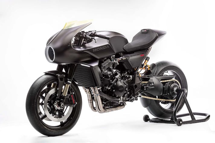 DIAVOLO NEROÈ apparsa allo stand Honda di EICMA 2017 sotto il reparto chiamato Design Studio. Il suo nome è Honda CB4 Interceptor Concept e non è un semplice esercizio di stile di qualche customizer di grido. Immaginata e disegnata dal Centro Stile Italiano Honda (precisamente da Valerio Aiello), questa concept dallo sguardo alieno anticipa le linee di futuri modelli di serie. In passato la Casa di Tokyo ha già provato a presentare concept che, dopo qualche anno di sviluppo, si sono poi svelate al grande pubblico in veste definitiva. E non sono illazioni: Honda stessa dichiara che questa Interceptor inaugura un nuovo filone stilistico denominato “Sport Endurance”.FORME ALIENECosì com’èla Honda CB4 Interceptor Concept è troppo estrema, ma ciò non toglie nulla al suo fascino demoniaco. La base meccanica è quella della nuova CB1000R (motore 4 cilindri in linea con funzione portante, telaio monotrave) ma molto è cambiato, a partire dalle sovrastrutture. La forma a siluro è data soprattutto dal nuovo gruppo serbatoio-coda, ora estremamente affusolato, mentre l’avantreno è dominato dal nostalgico cupolino, dai semimanubri chiusi e dal faro tondo. Questo alloggia in una vera e propria turbina eolica che, generando energia attraverso l’inerzia della moto, alimenta uno schermo touch-screen integrato nel serbatoio, sempre connesso per fornire mappe digitali, effettuare chiamate d’emergenza o semplicemente collegare i propri dispositivi.