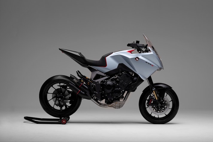 La carrozzeria della Honda CB4 X Concept lascia in bella vista il motore ereditato dalla CB650R. Il quattro cilindri qui è abbinato a un grintoso silenziatore sdoppiato realizzato da SC Project, che con la sua forma a canne mozze lascia scoperto il cerchio, sul lato opposto al forcellone monobraccio. Le ruote sono entrambe da 17 pollici a ribadire una chiara vocazione stradale. Al momento è presto per dire se da questo mezzo deriverà poi un modello di serie, ma sognare non costa nulla.