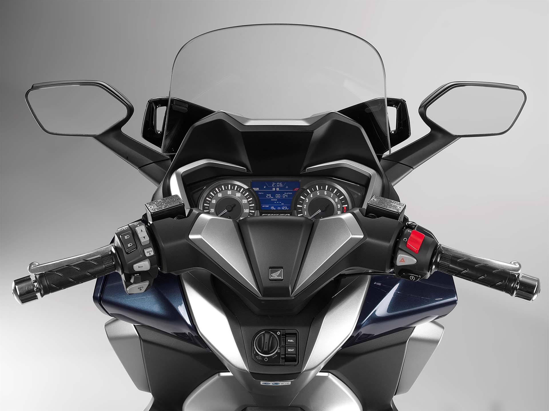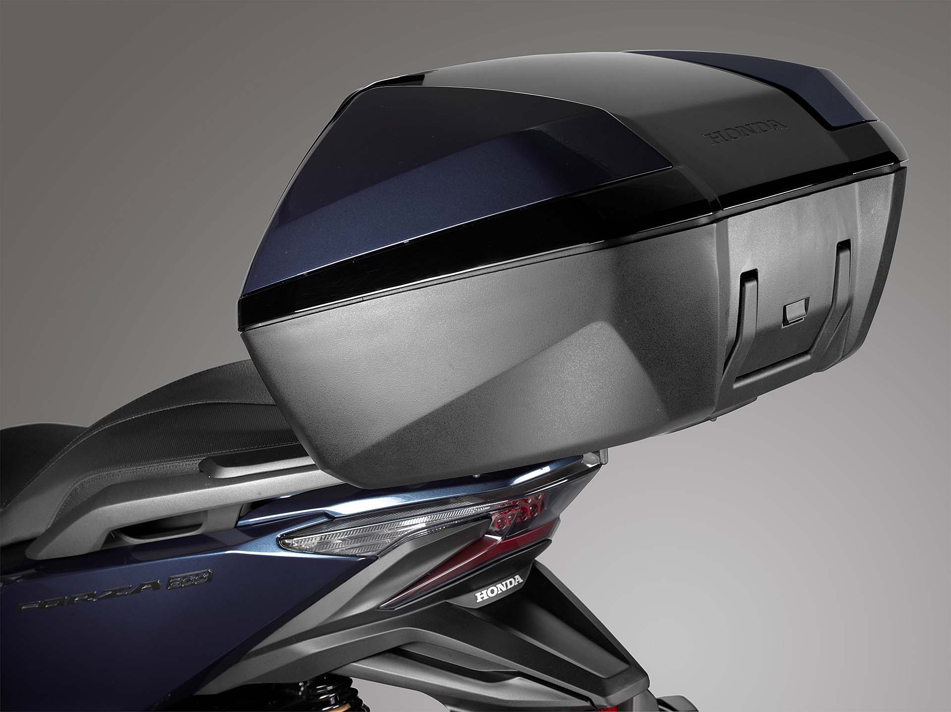 Parlando di equipaggiamento, il nuovo Honda Forza 300 è molto completo. Rispetto al precedente modello migliora la protezione aerodinamica, grazie al nuovo parabrezza regolabile elettricamente su un’escursione di 140 mm. Il vano sottosella ospita due caschi integrali e nel retro dello scudo anteriore c’è un vano dotato di serratura che può contenere una bottiglietta d’acqua, uno smartphone o altri device elettronici, ricaricabili tramite una presa 12V. L’impianto luci è full LED, c’è la chiave Smart Key (che comanda anche il bauletto) e la strumentazione è un misto di quadranti analogici e LCD. Sarà disponibile in quattro colorazioni: blu, nero, grigio e bianco, mentre la lista accessori comprende il portapacchi, il bauletto da 45 litri per due caschi integrali, le manopole riscaldabili e l’allarme.