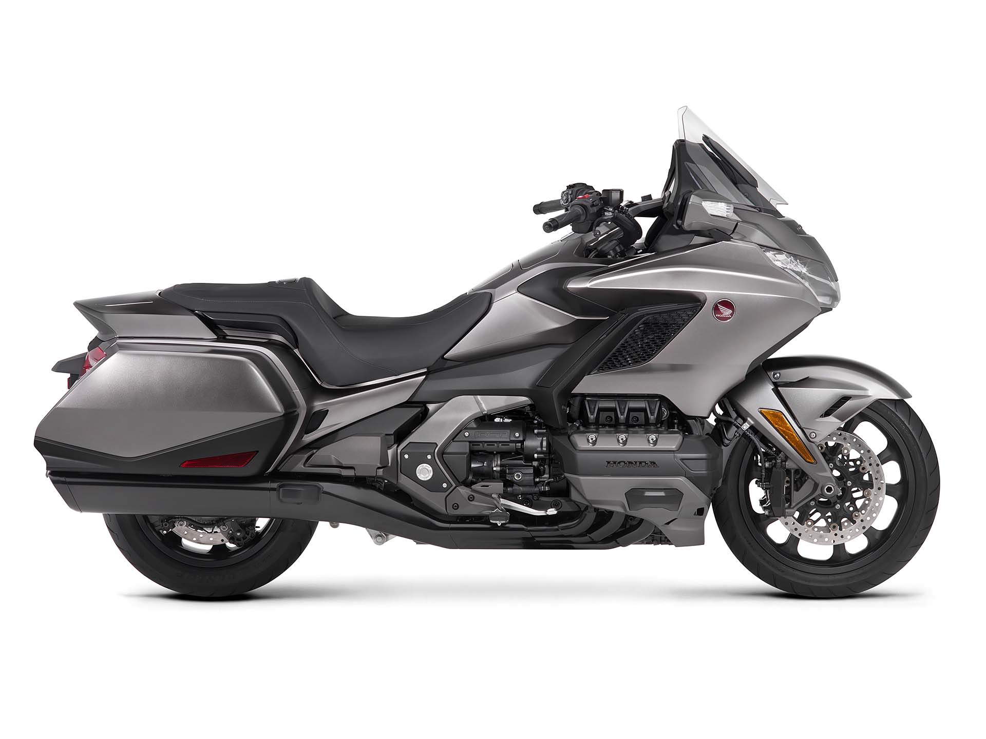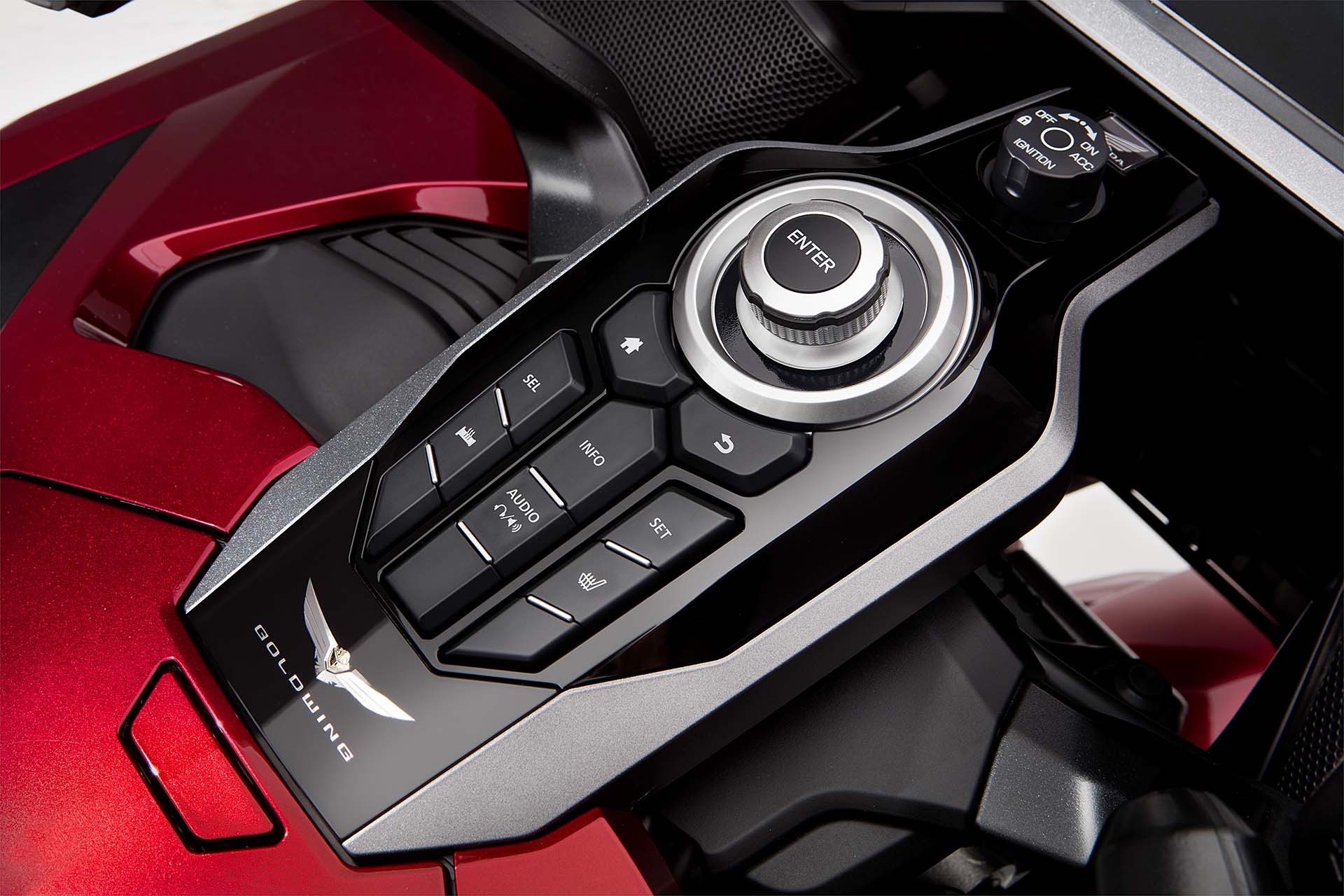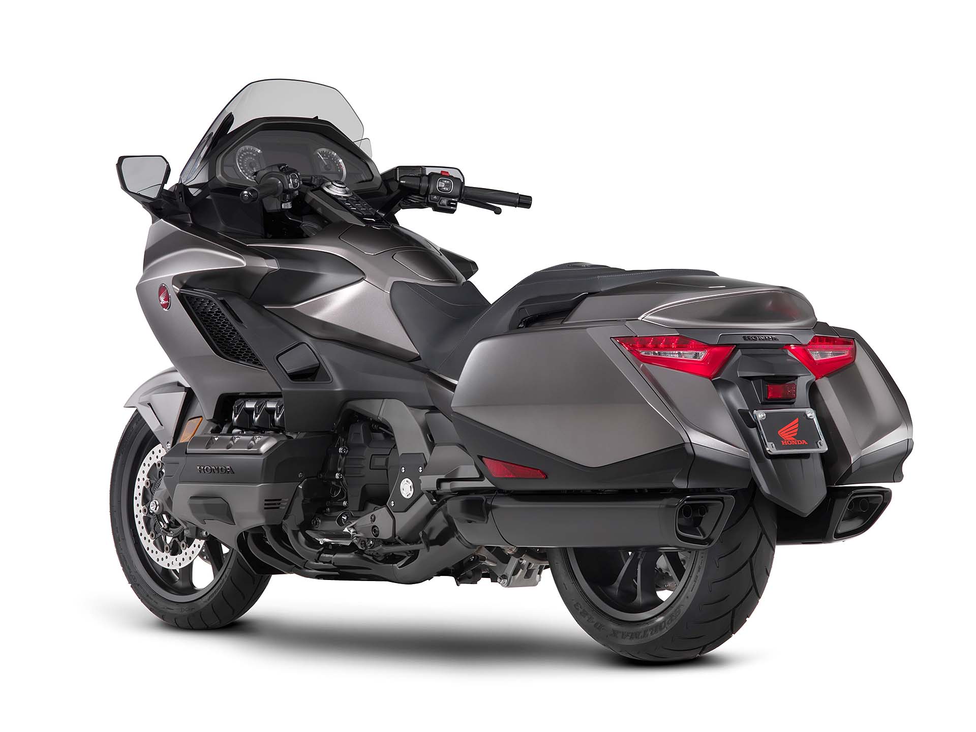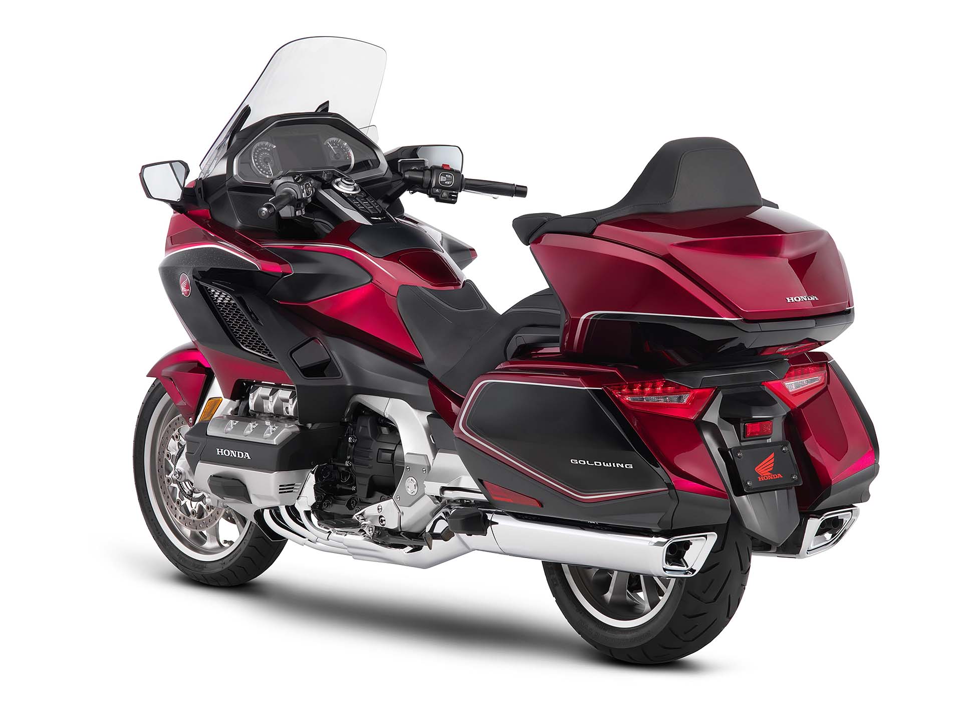 ALL INCLUSIVEOvviamente la lista di sistemi accessori alla guida offerta di serie è lunghissima. L’impianto luci è full Led, il cruise control è del tipo elettronico (grazie al TBW), la strumentazione è composta da tre display LCD e uno schermo TFT a colori da 7” ed è consultabile per mezzo dei pulsanti sopra al manubrio. Garantita la connettività Apple CarPlay, per collegare l’iPhone alla moto. La chiave è del tipo Smart Key mentre la capacità di carico è stata leggermente ridotta: secondo un’indagine tra i clienti Honda, non era indispensabile tutto lo spazio disponibile sul vecchio modello. E comunque, la versione Tour (sia DCT/Airbag sia manuale) prevede un top box capace di contenere due caschi integrali, portando così la capacità totale a 110 litri. La Gold Wing “base” sarà disponibile solamente in grigio metalizzato, la Tour rossa o bianca e la Tour DCT/Airbag rossa/nera oppure nero notte.